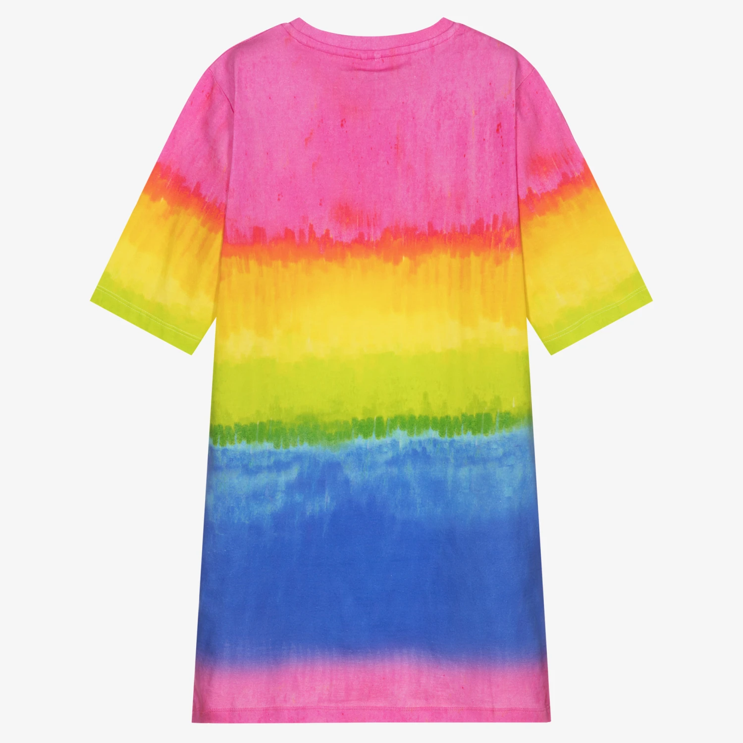 Colourful rainbow T-shirt dress for teen girls by British designer Stella McCartney Kids, made in soft organic cotton jersey. It has a bright and bold ombré print and a fun fringed hemline.