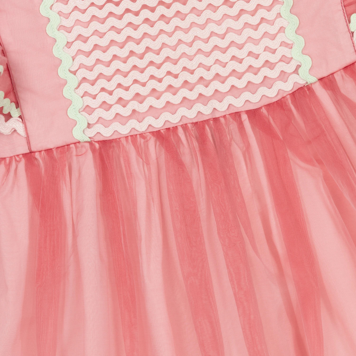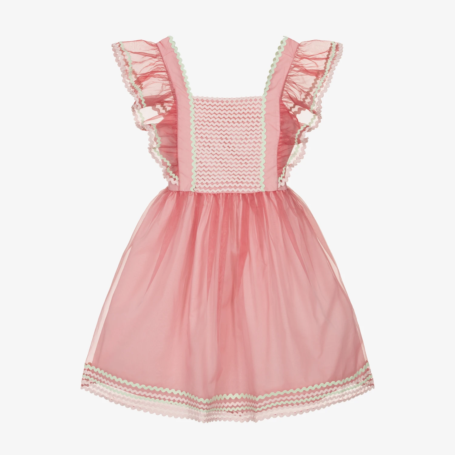 Stella McCartney Kids design this elegant rose pink organza dress for teen girls, embroidered with pastel pink and mint green ric rac trims. Embodying the light-hearted spirit of summer, this pretty dress has sheer organza flutter sleeves and a cut-out trim on the back. The full, flared skirt adds a feminine dimension to the silhouette. Lined in soft cotton, it is made using recycled materials for a positive, Earth-friendly impact. It has a detachable, popper organza bow on the back to switch up your teens look, depending on the occasion.