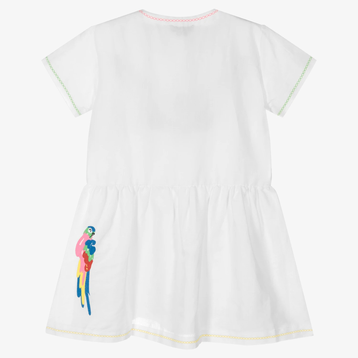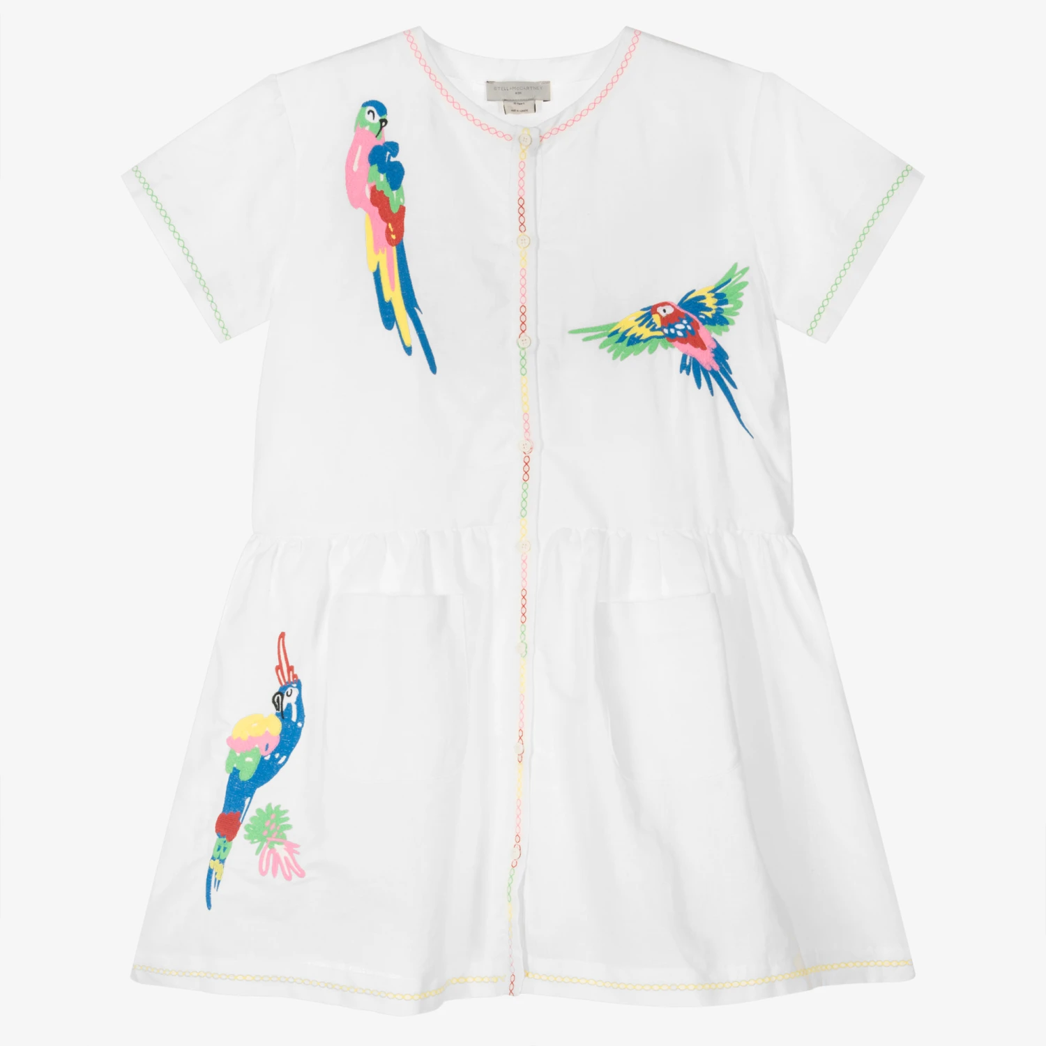 White dress for teen girls by Stella McCartney Kids, made in a soft linen and cotton blend and lined in lightweight cotton voile. This loose fitting dress has colourful tropical parrots embroidered on the front and back for a playful look. Cool and comfoirtable to wear, it has colourful embroidered trims and useful patch pocktes on the front. There are branded button fastenings on the front for discreet designer detailing. The Stella McCartney fit can be quite small so choose a size up if you want room to grow.