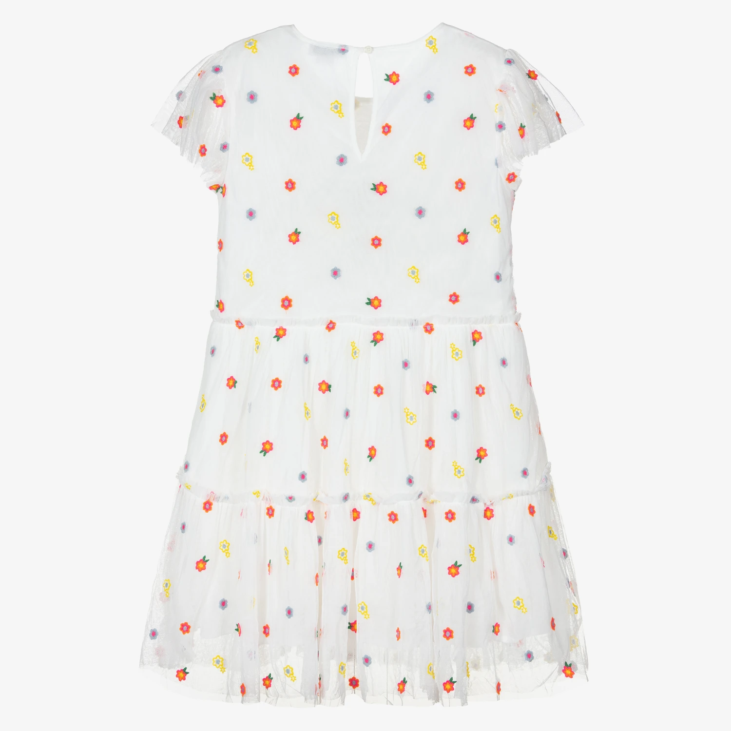 White tulle dress for teen girls by Stella McCartney Kids, embroidered all over with fun and colourful flowers. It has pretty flutter sleeves and a feminine tiered skirt, with a charming keyhole button fastening on the back. The fabric is made from recycled materials and is fully lined in lightweight cotton for comfort. The Stella McCartney fit can be quite small so choose a size up if you want room to grow.