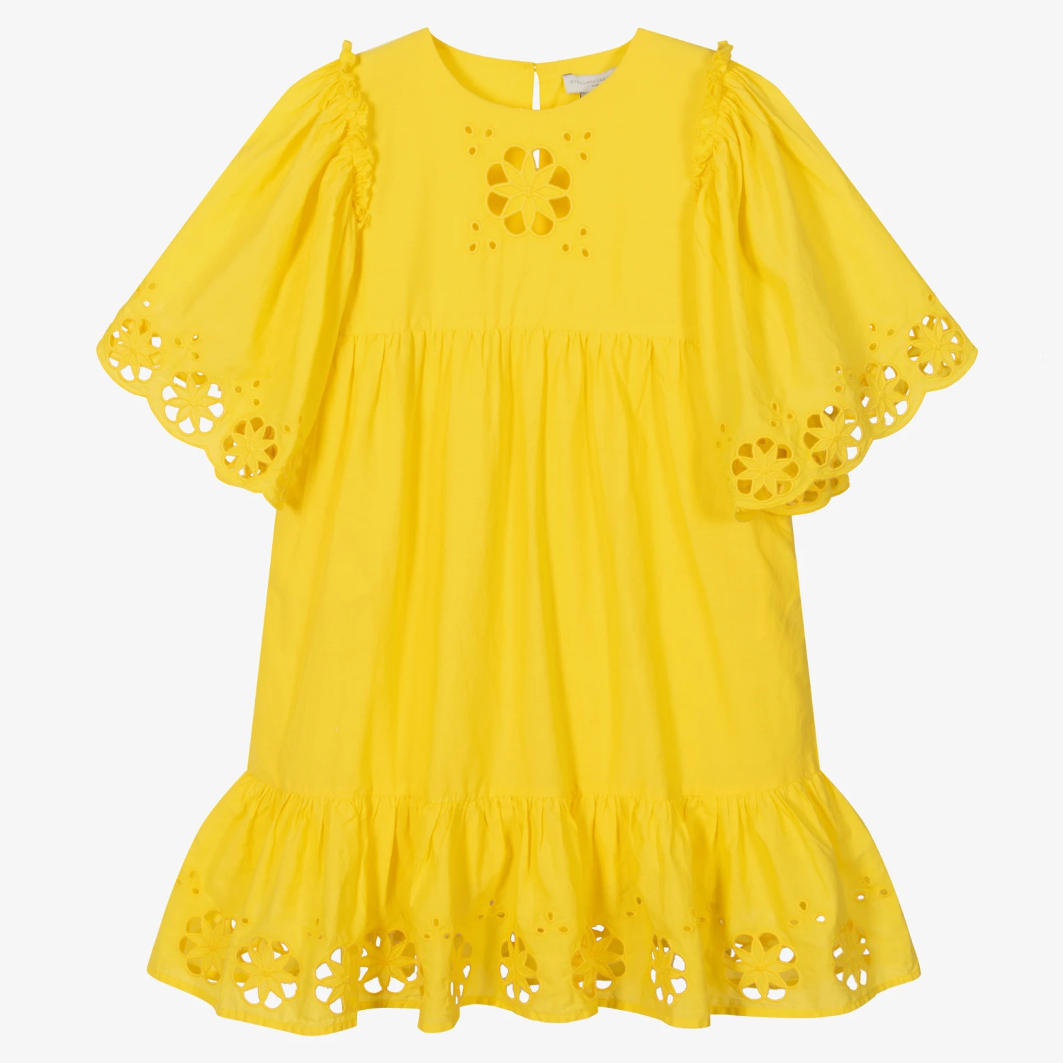 Bright yellow dress for teen girls by Stella McCartney Kids, with stunning floral broderie anglaise detailing. Made and lined in lightweight organic cotton voile, it has beautiful butterfly sleeves and an elegant keyhole button fastening on the back.