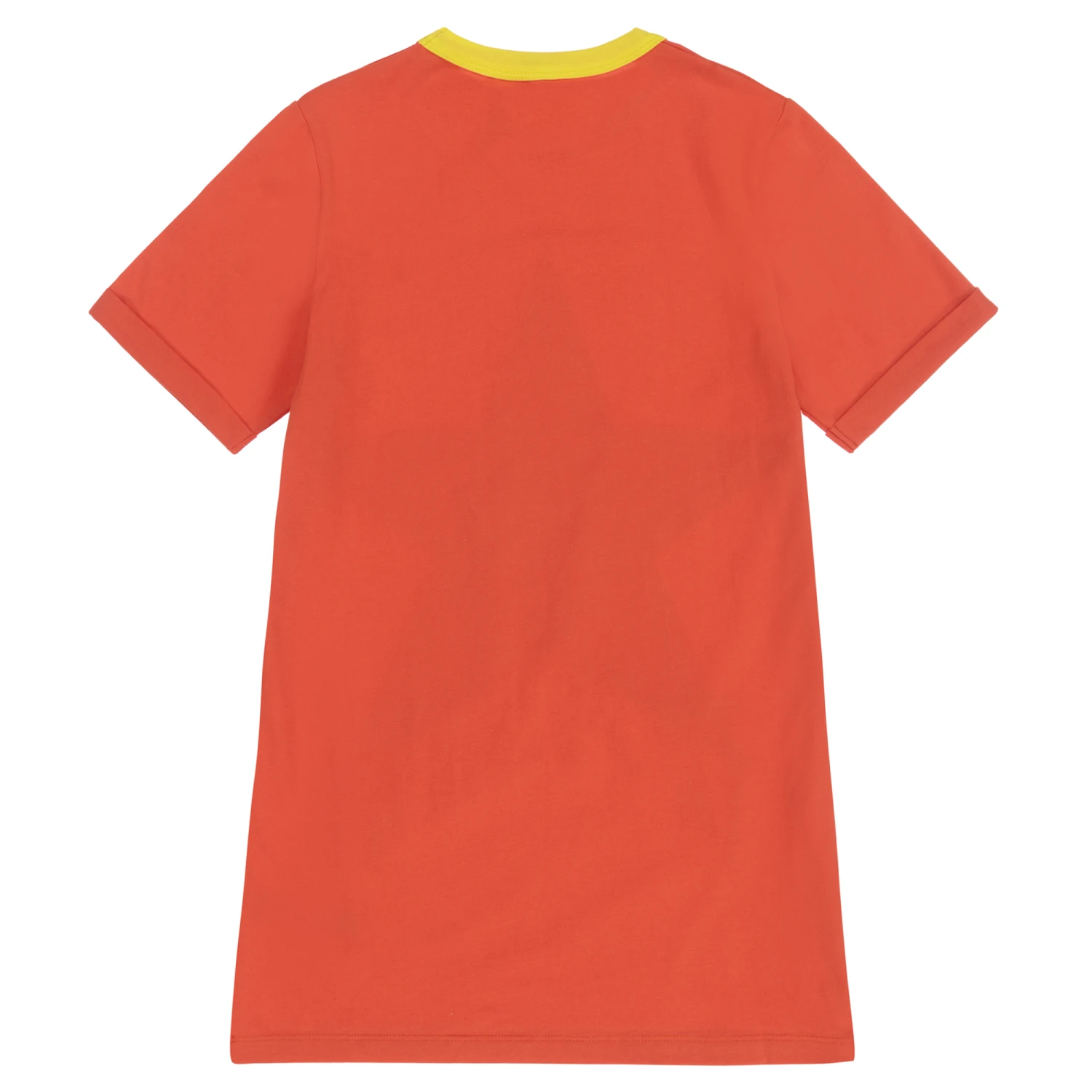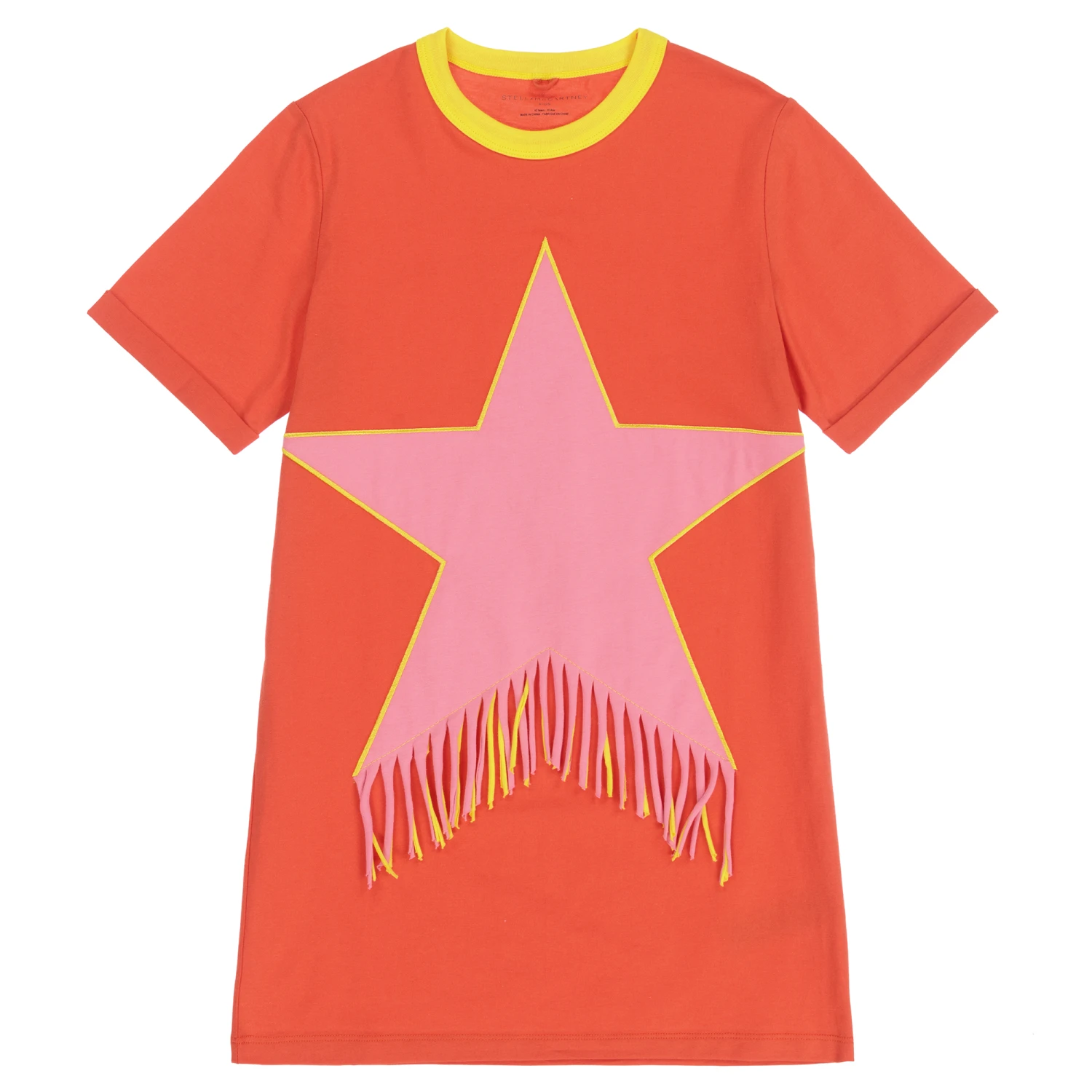 Teen girls loose-fit orange T-shirt dress by Stella McCartney Kids, made from soft cotton jersey. It has a yellow neckline and a pink star motif, with pink and yellow fringed trims.