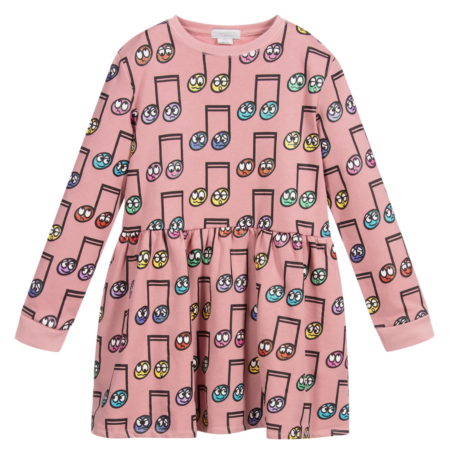 Dusky pink dress for teen girls by Stella McCartney Kids. Made in soft and stretchy sweatshirt jersey with a fleecy underside. It has a musical note pattern, with colourful glitter detail and side pockets.