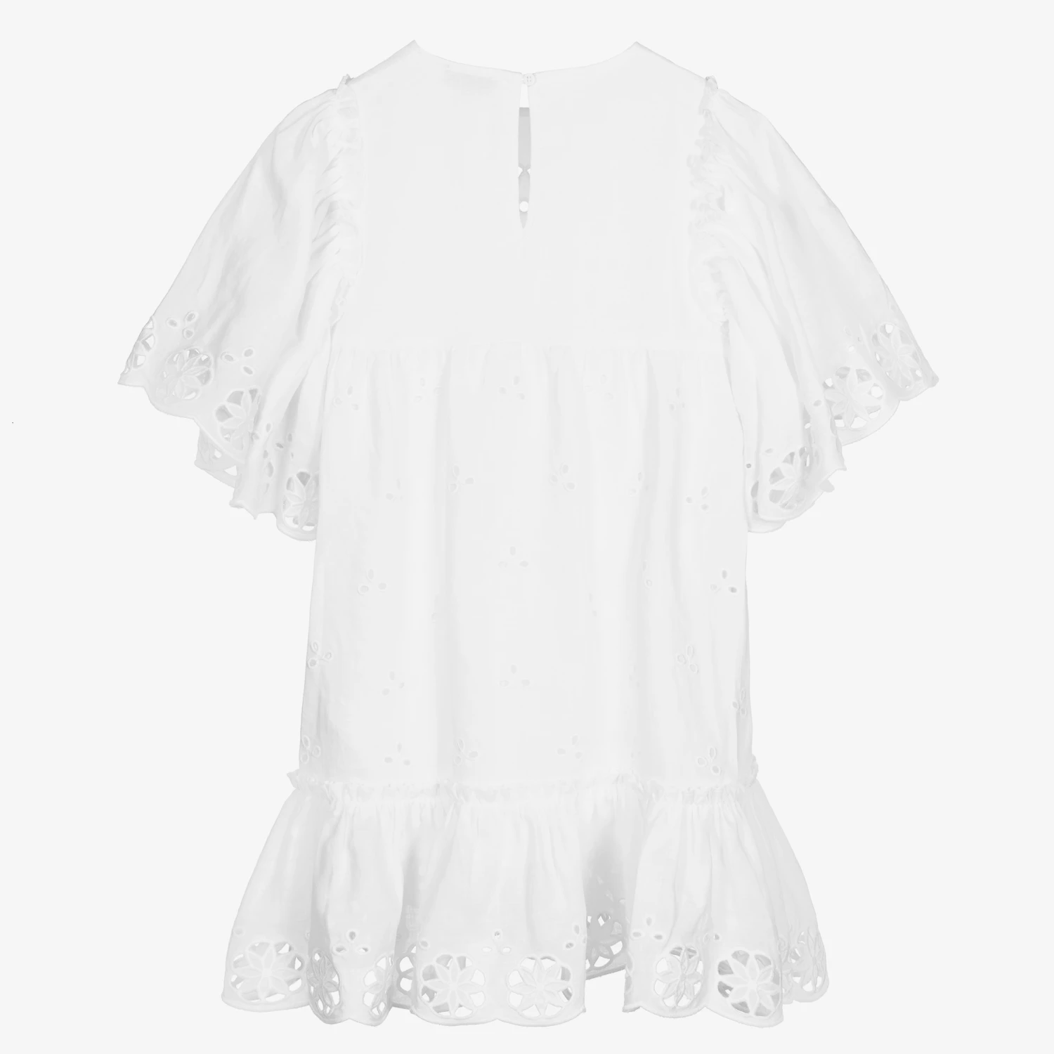 Teen girls white dress by Stella McCartney Kids, with cutwork and broderie anglaise floral detailing. Soft and lightweight, this beautiful dress is made in linen-feel ramie with useful side pockets. Lined in soft cotton, it has flutter sleeves and ruffle trims.