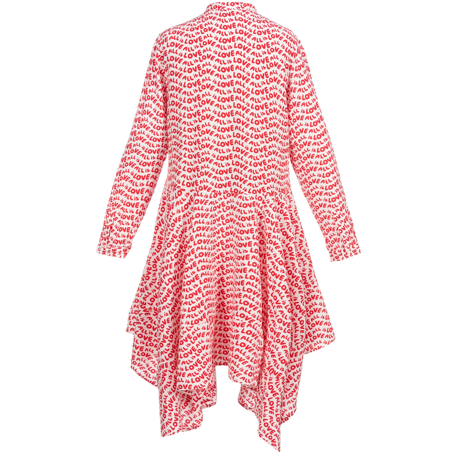 Teen girls white dress by Stella McCartney Kids, exclusive to Childrensalon. As seen in the main collection, it has a red ‘All is Love’ pattern. It is made in lightweight viscose and has an asymmetric handkerchief hem. There are button fastenings on the front.