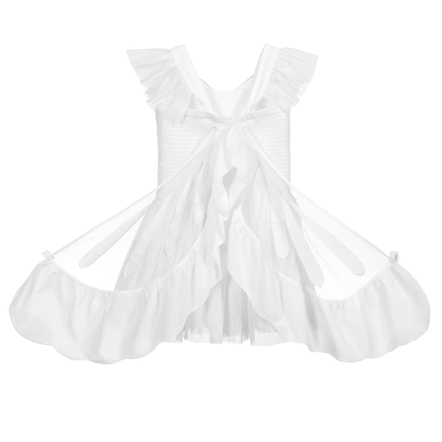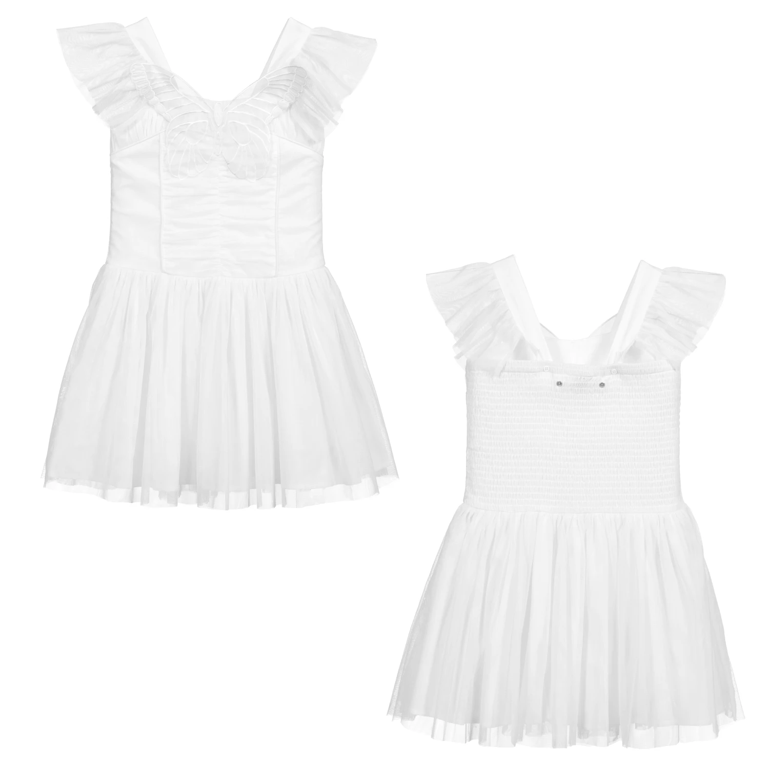 Teen girls white fit and flare mini dress by Stella McCartney Kids, made in soft tulle. It has a butterfly appliqué on the front and the shoulder straps are adjustable, with tulle ruffe trims. The back is ruched and has removable butterfly wings.
