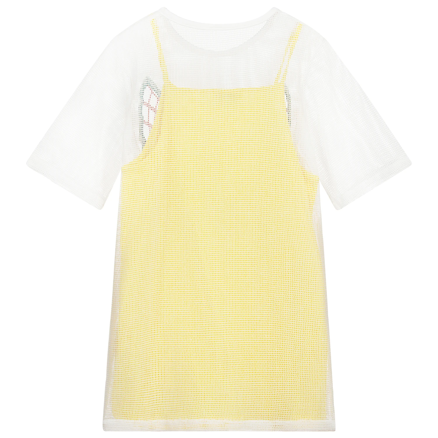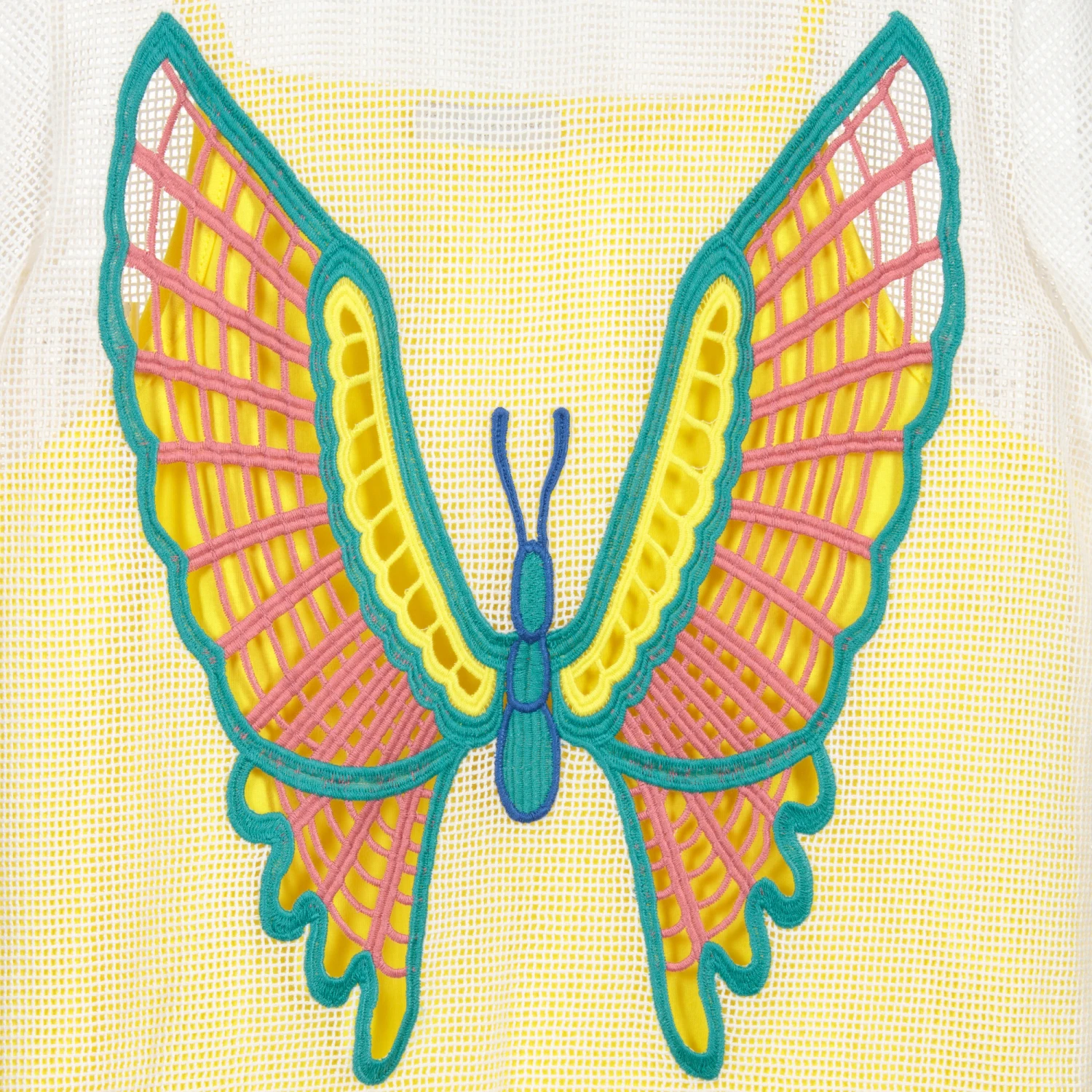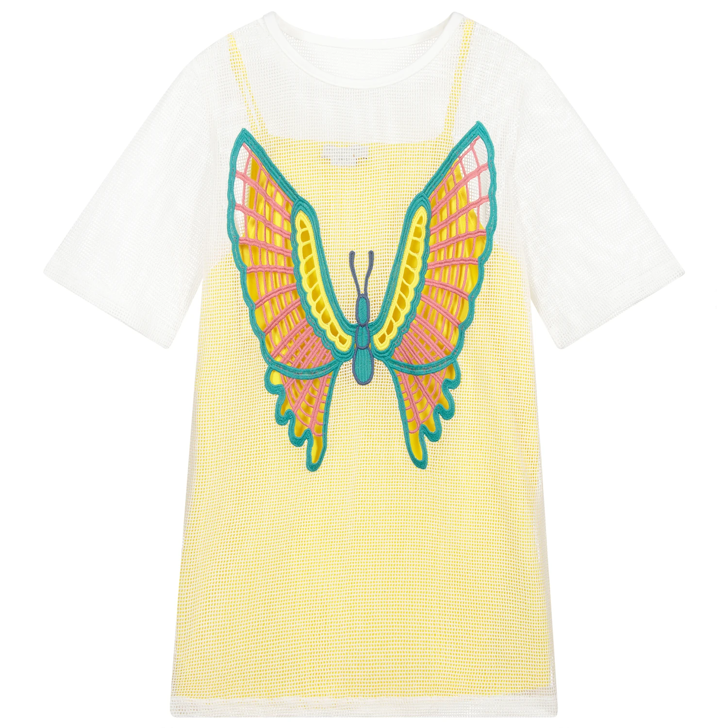 Teen girls yellow two-piece dress set by British designer Stella McCartney Kids, made in soft jersey. It has a separate white mesh overlay, beautifully embroidered with a large colourful butterfly.