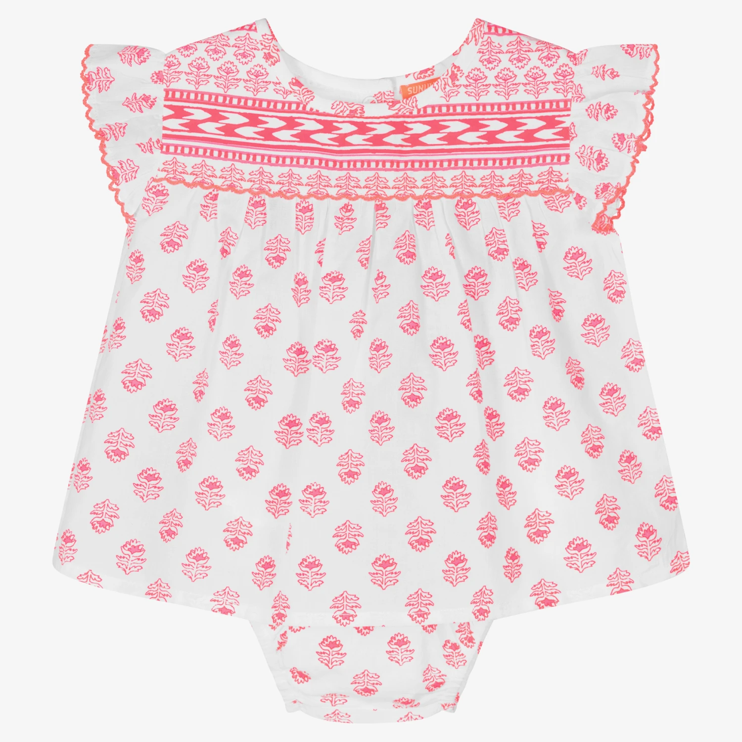 Off-white beach dress for baby girls by Sunuva, made from soft and lightweight cotton voile. It has a bright pink floral aztec pattern, with ruffled sleeves and looped trims. There are useful popper fastenings on the back, and matching knickers for added modesty.