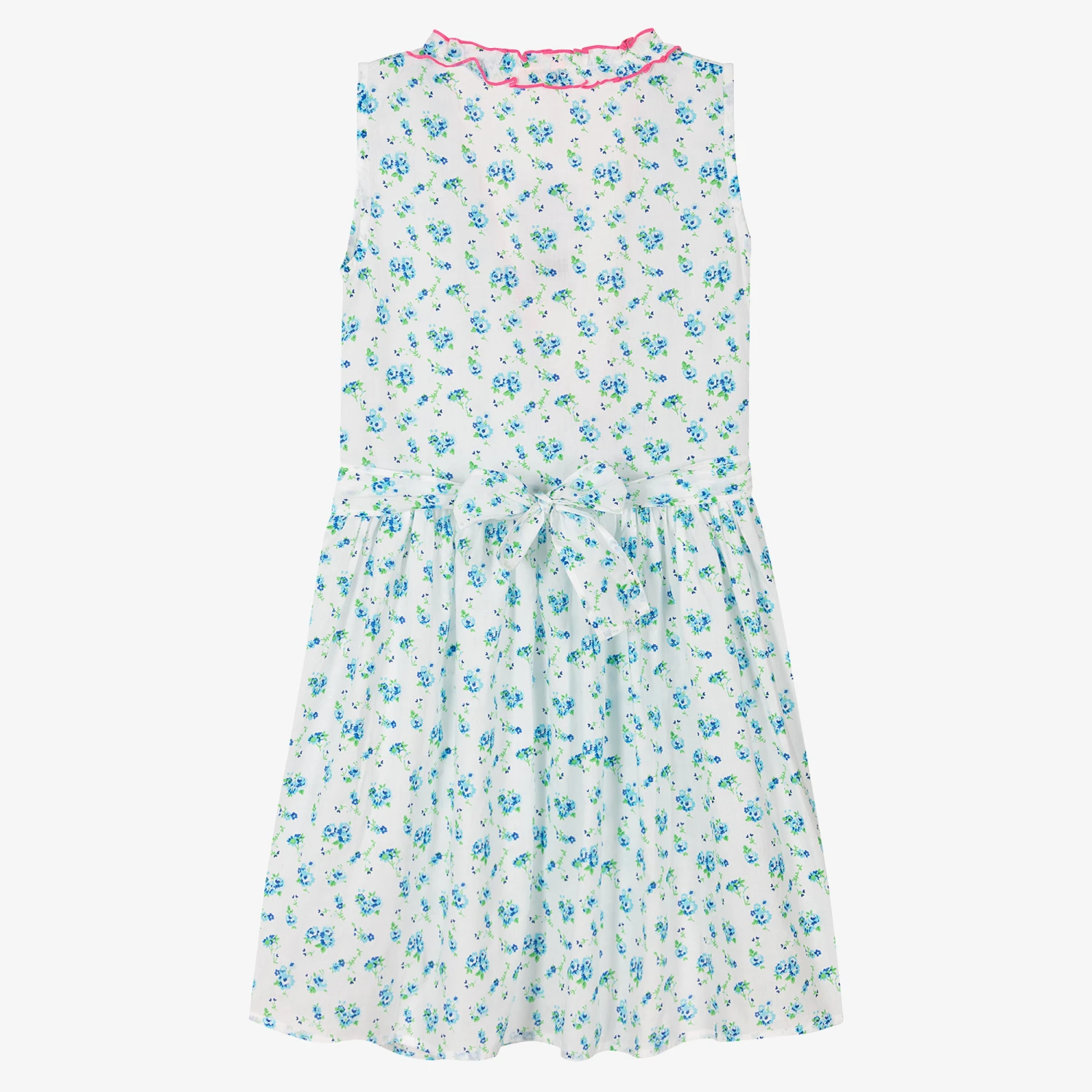 Exclusive to Childrensalon, a blue and green wrap dress for teen girls by British swimwear brand Sunuva. Ideal to wear on the beach, this chic piece is patterned in a vintage-inspired floral print on a white background. Made in a soft cotton weave, it has a lovely lightweight feel with bright pink edging and ruffle trim detailing. It wraps around the front and ties with a sash on the side for a chic look.