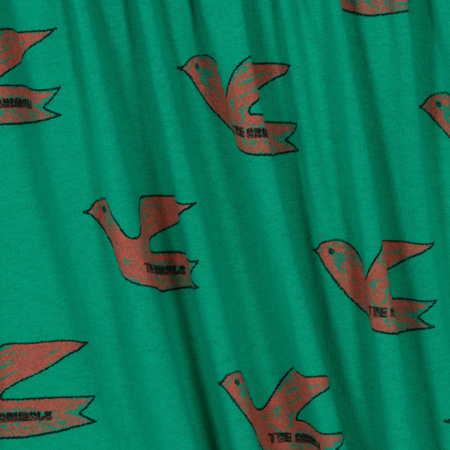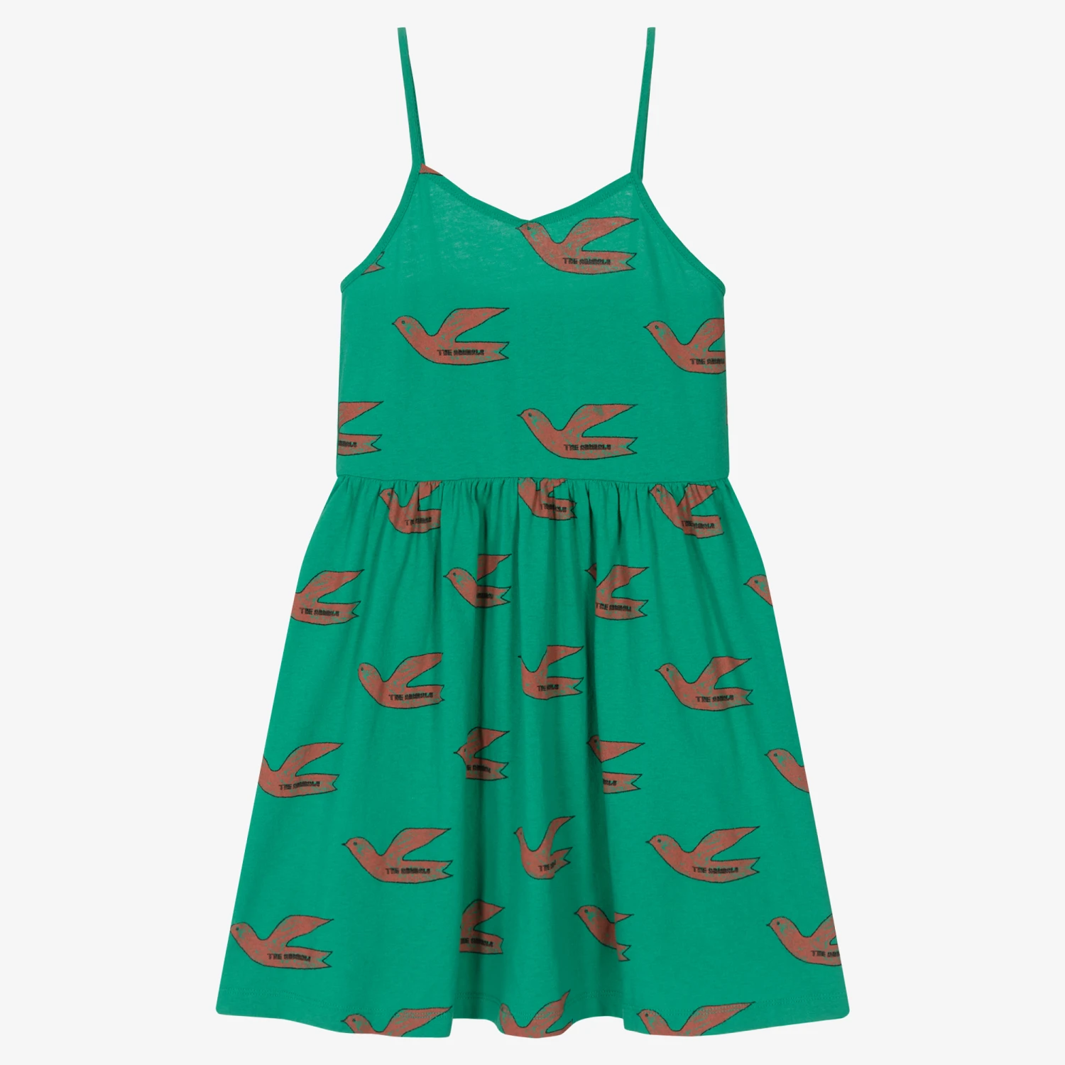 Green cotton dress for teen girls by The Animals Observatory, with a red bird and a black logo pattern in a distressed, hand-drawn style. Made in comfortable jersey with spaghetti straps and a full, gathered skirt, it is ideal for casual, relaxed, sunny days.
