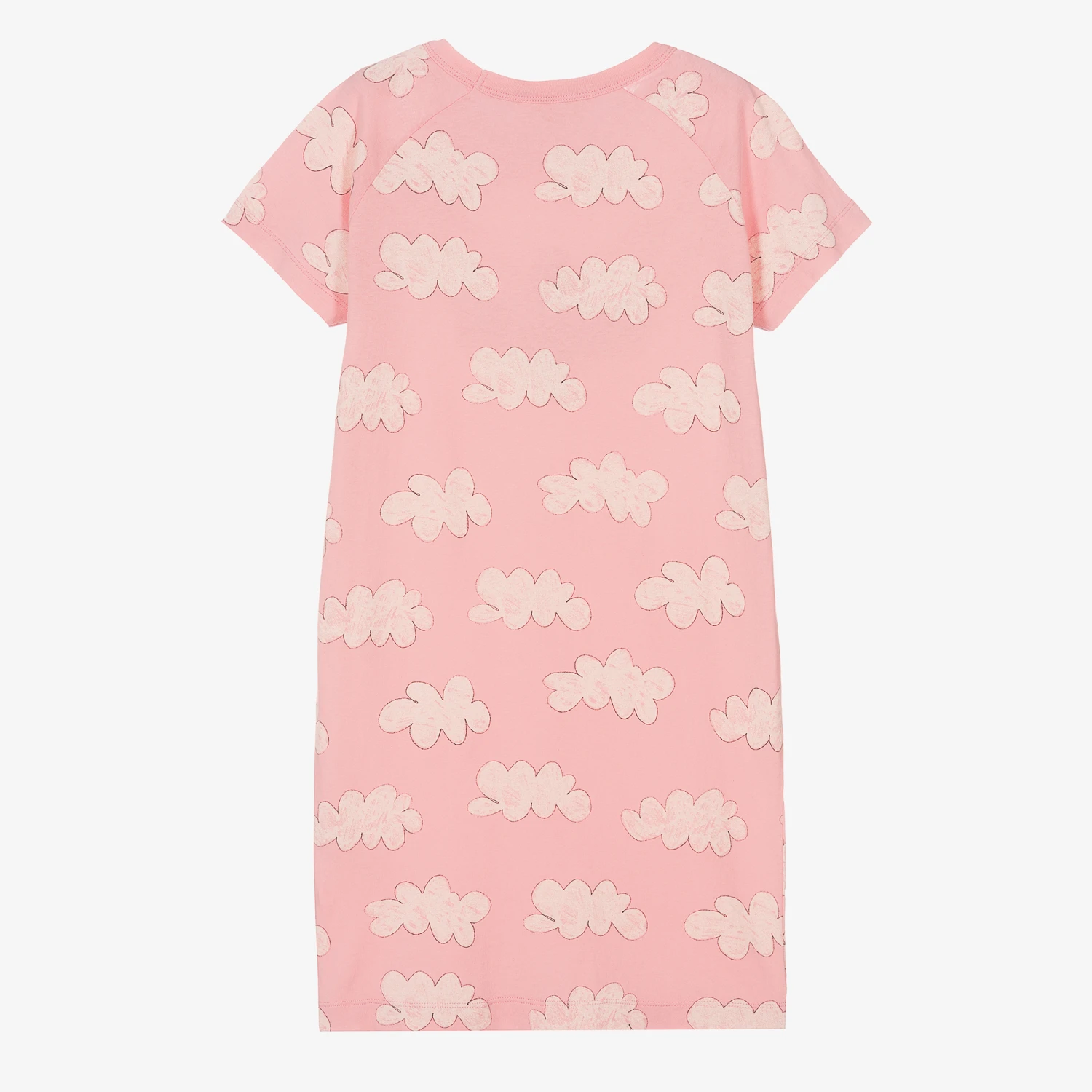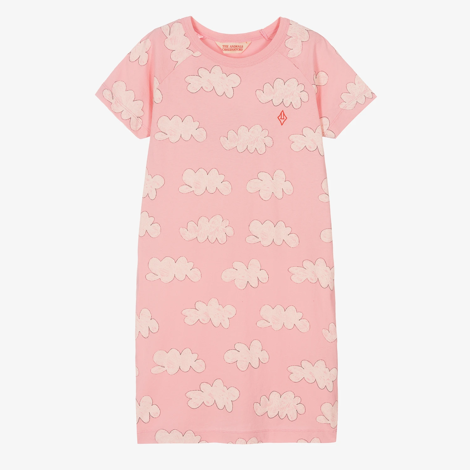 Pink T-shirt dress for teen girls by The Animals Observatory, with a red embroidered logo on the chest. Casual and comfortable, it has a fun all over cloud print and is made in soft, lightweight cotton jersey.