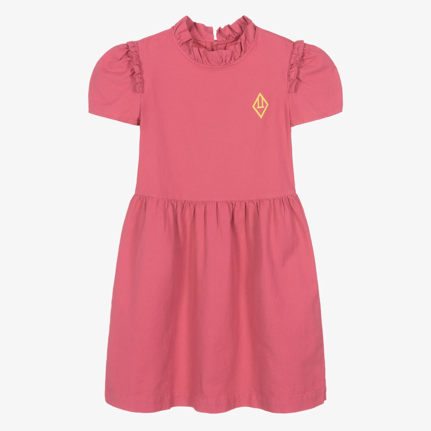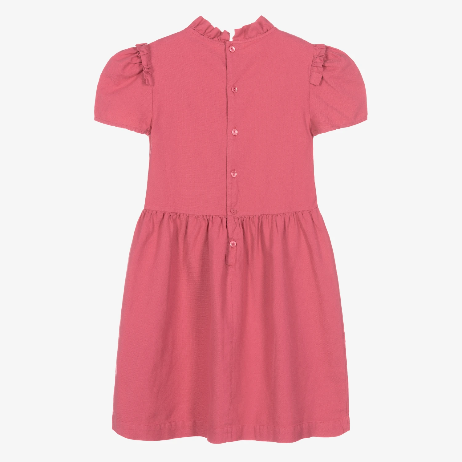 A vibrant pink dress for teen girls by The Animals Observatory, signed with a contrast yellow logo print on the chest for instant brand identity. Made in a soft cotton and linen blend, this casual design has a ruffled collar and matching trims over the shoulders for a vintage-inspired look. It fastens with tonal buttons on the back and gently gathers at the waist.