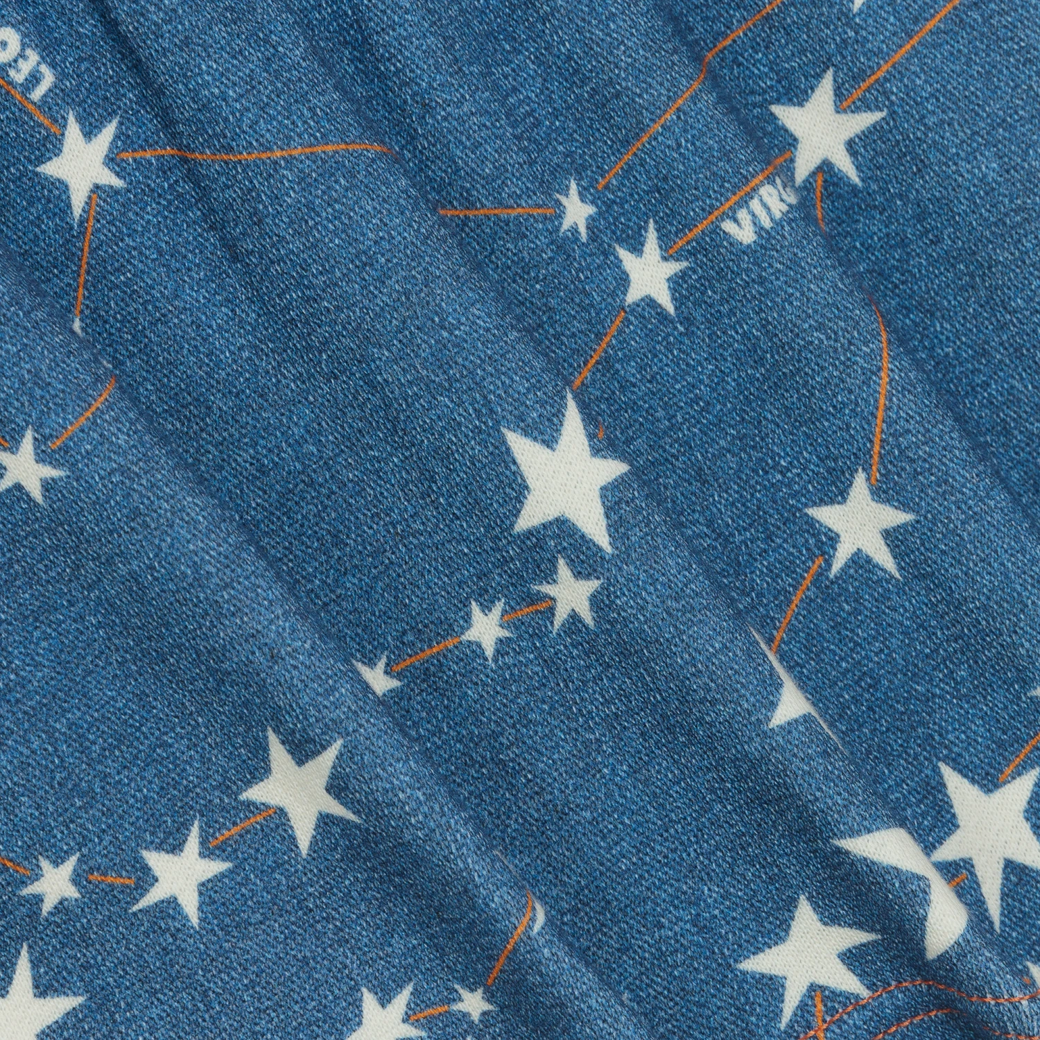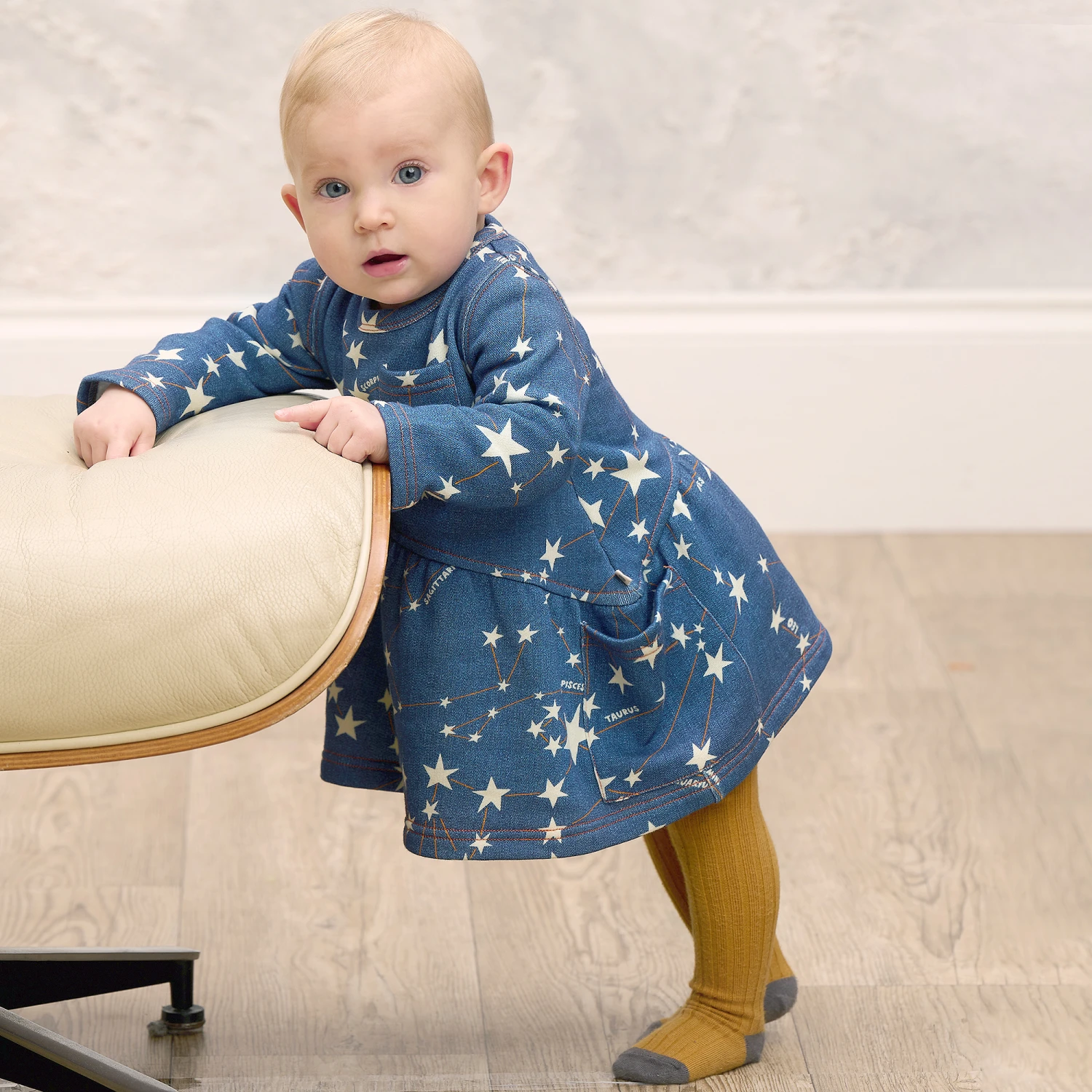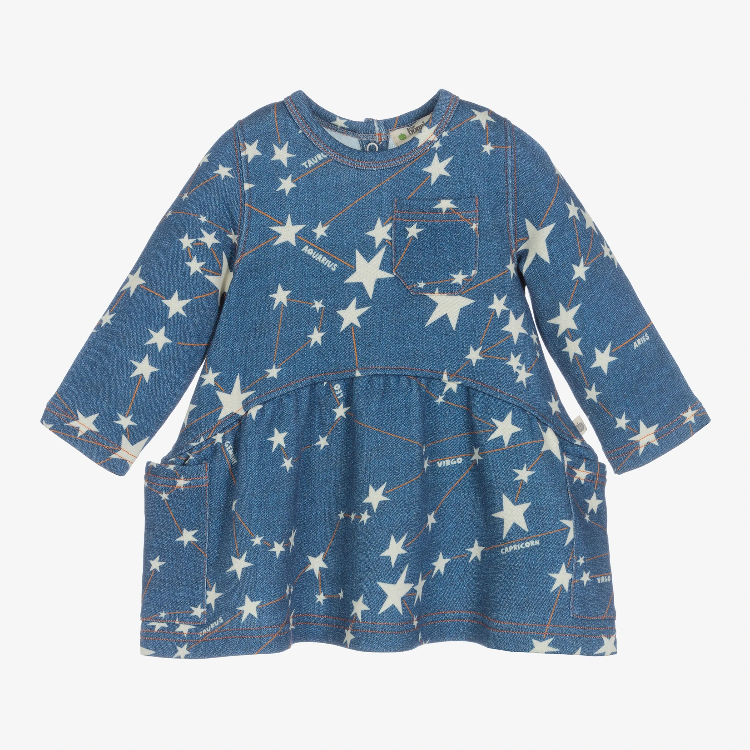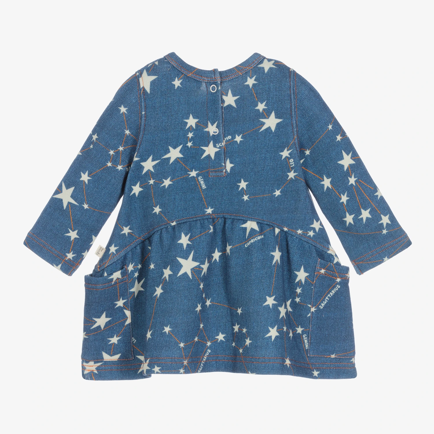 Blue denim-look dress for baby girls by The Bonnie Mob, made in soft organic cotton jersey. Using an eco-friendly printing technique, it has an all-over star print in ivory and orange. The waistline is curved and has a gathered skirt. There are patch pockets on the sides and back popper fastenings.