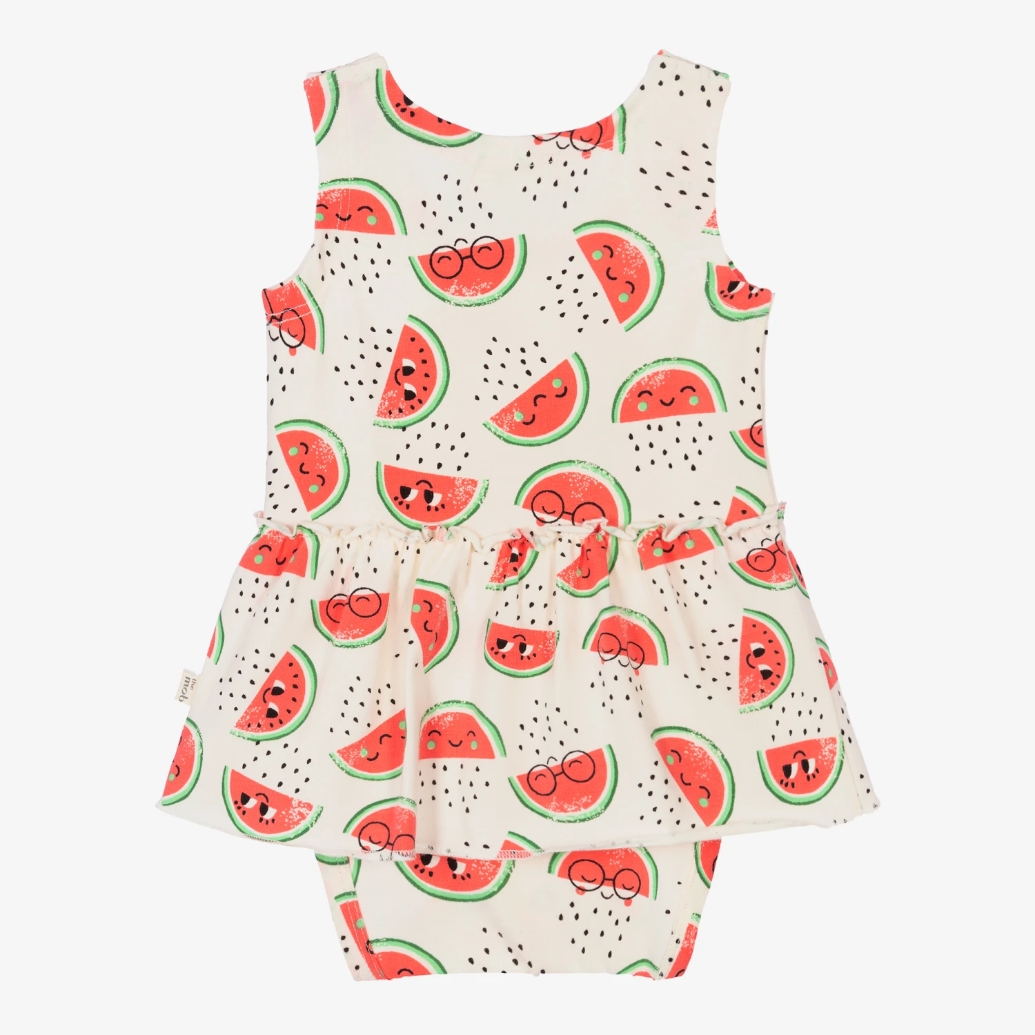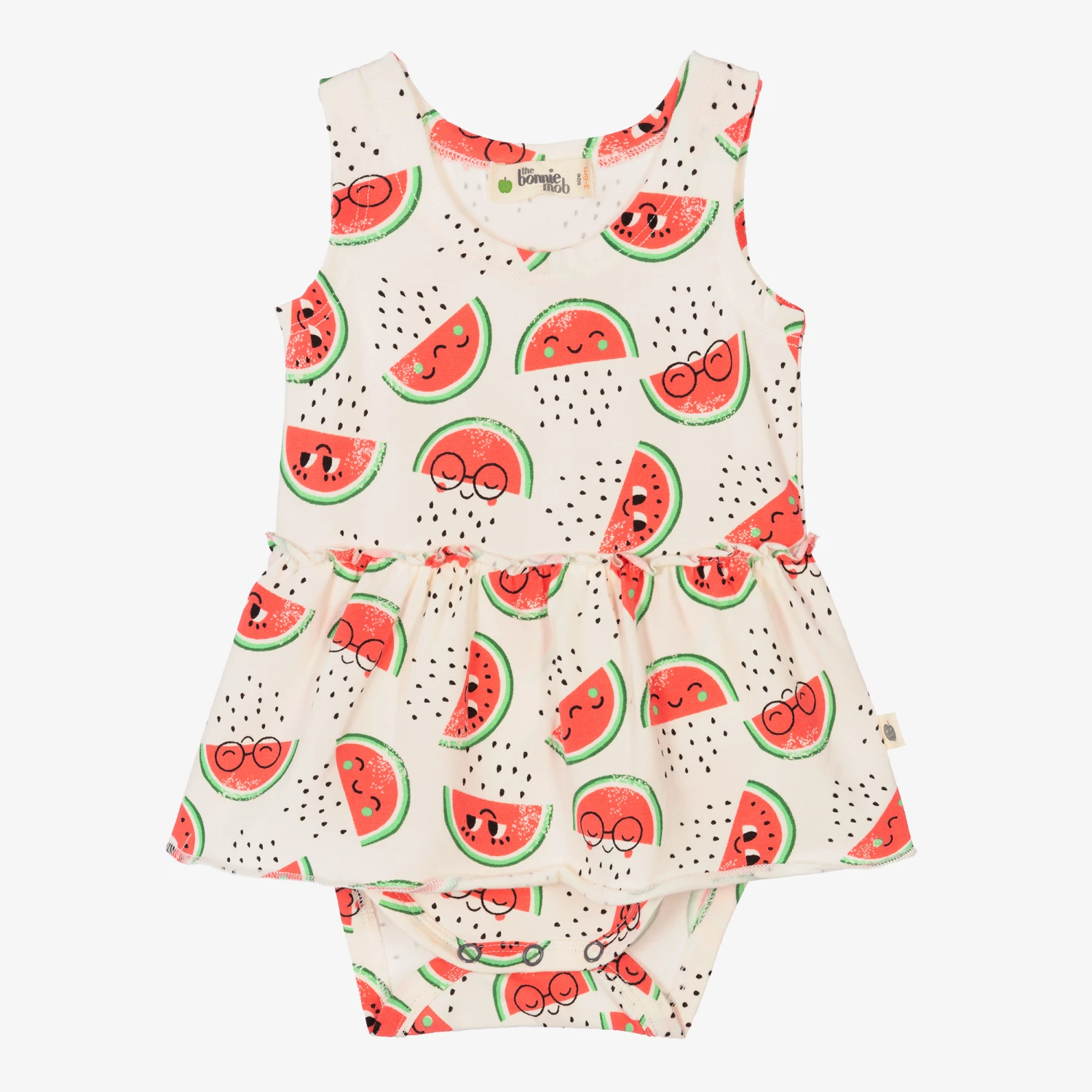 Baby girls ivory dress with attached knickers by The Bonnie Mob, made in soft organic cotton jersey. Patterned in an all-over pink and green watermelon print, this sweet, sleeveless dress has a gently pleated skirt with frill detail on the waistline. The attached knickers have popper fastenings between the legs for quick and easy changing.