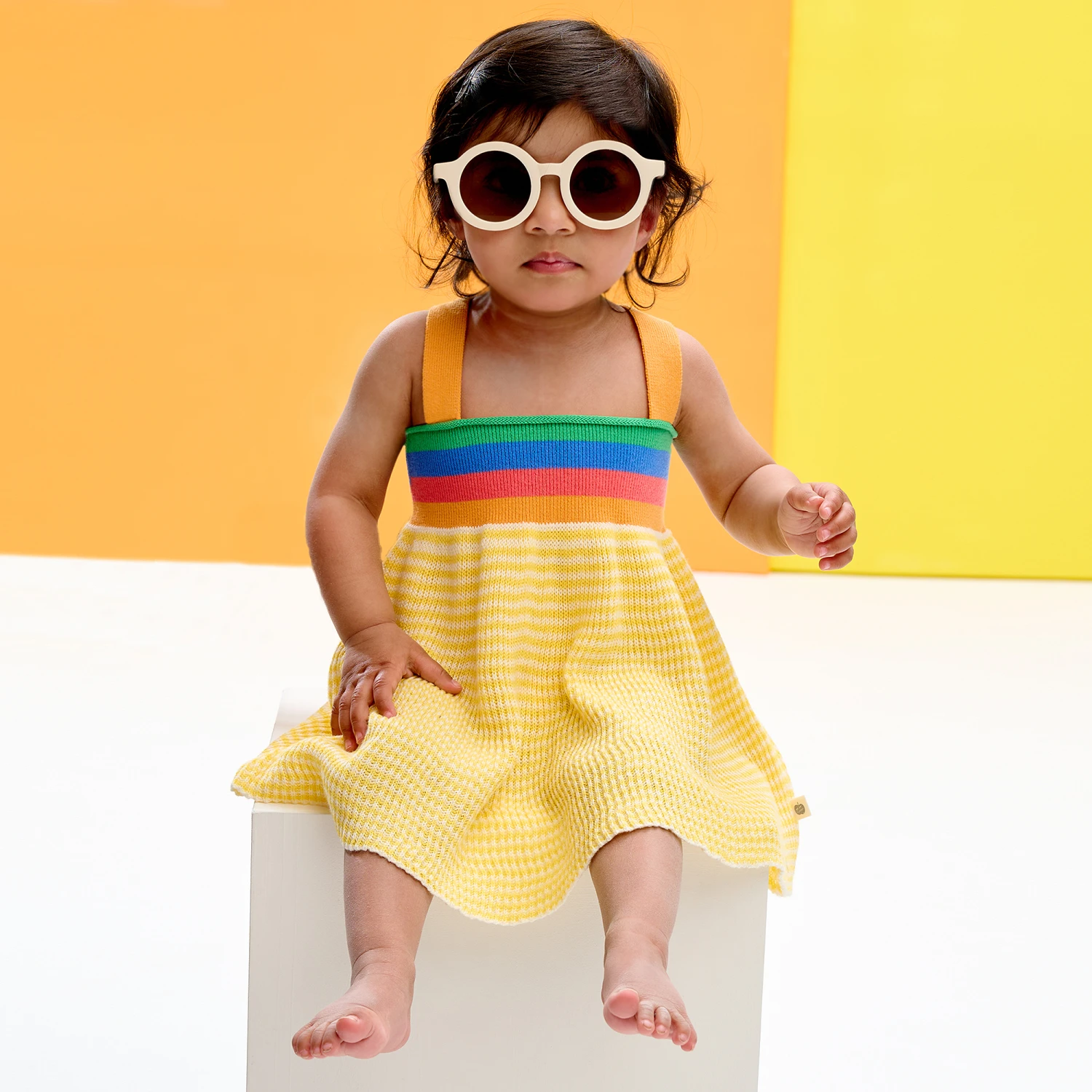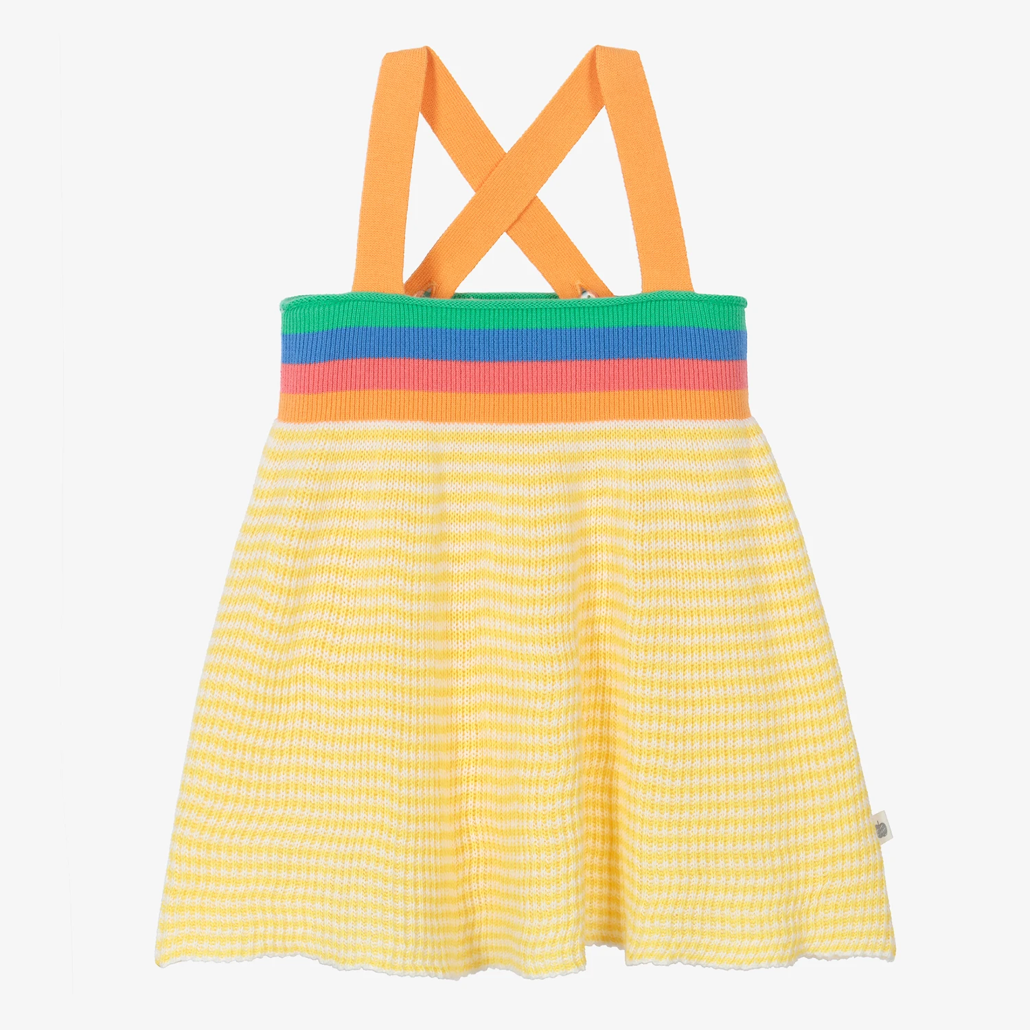 Yellow striped sun dress for baby girls by The Bonnie Mob, made in a super soft and lightweight organic cotton. It has a finely ribbed bodice in a blue, orange, green and pink stripe for stand-out colour. Delicate on the skin, the contrasting yellow and white stripe skirt is loosely knitted for lasting comfort. The adjustable orange shoulder straps cross over on the back with concealed button fastenings for a great fit.