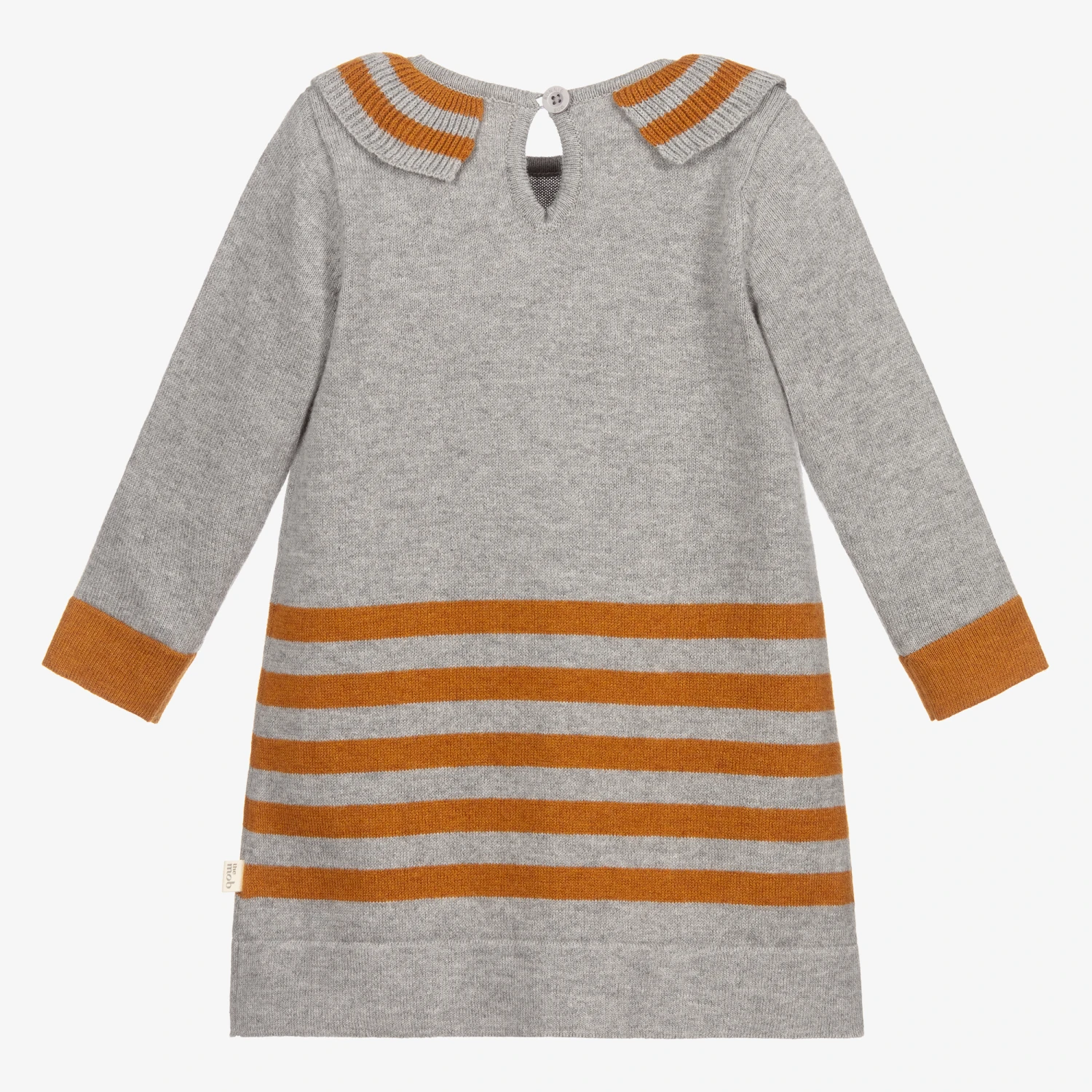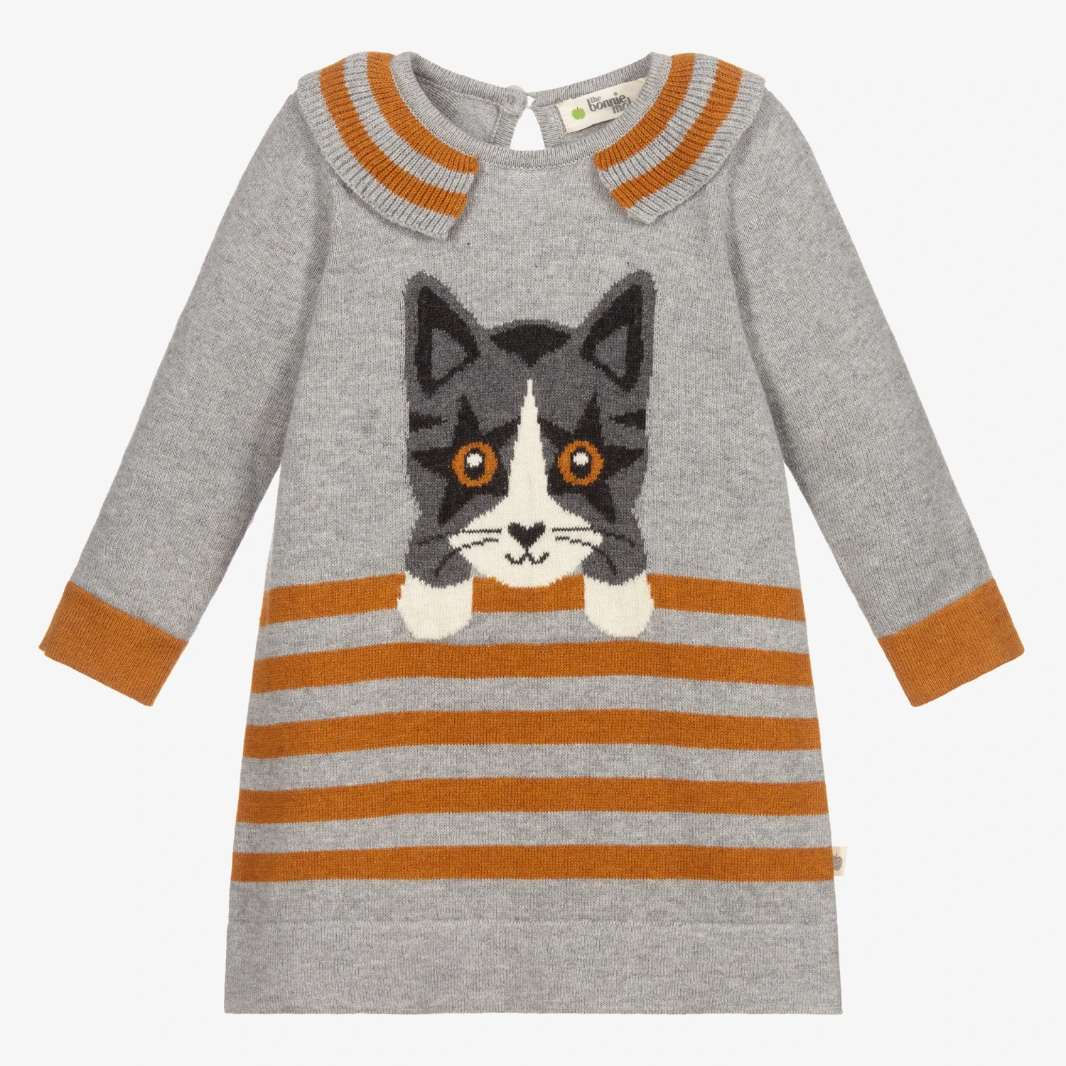 Grey dress for baby girls, by The Bonnie Mob. Made from a lovely blend of organic cotton and cashmere, it has a cute jacquard cat motif design, mustard yellow trims, and a pretty ruffle collar.