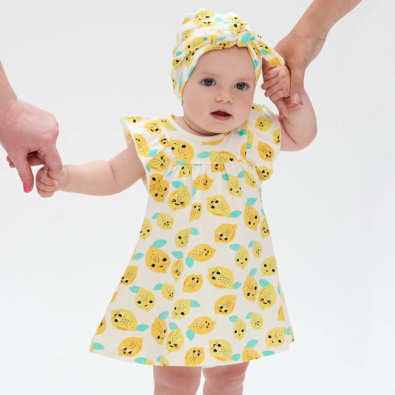 An adorable yellow lemon print patterns this ivory dress for baby girls from The Bonnie Mob. Made in soft organic cotton jersey, it is gathered from the bodice, with pretty ruffles over the shoulders and a single button fastening on the back.