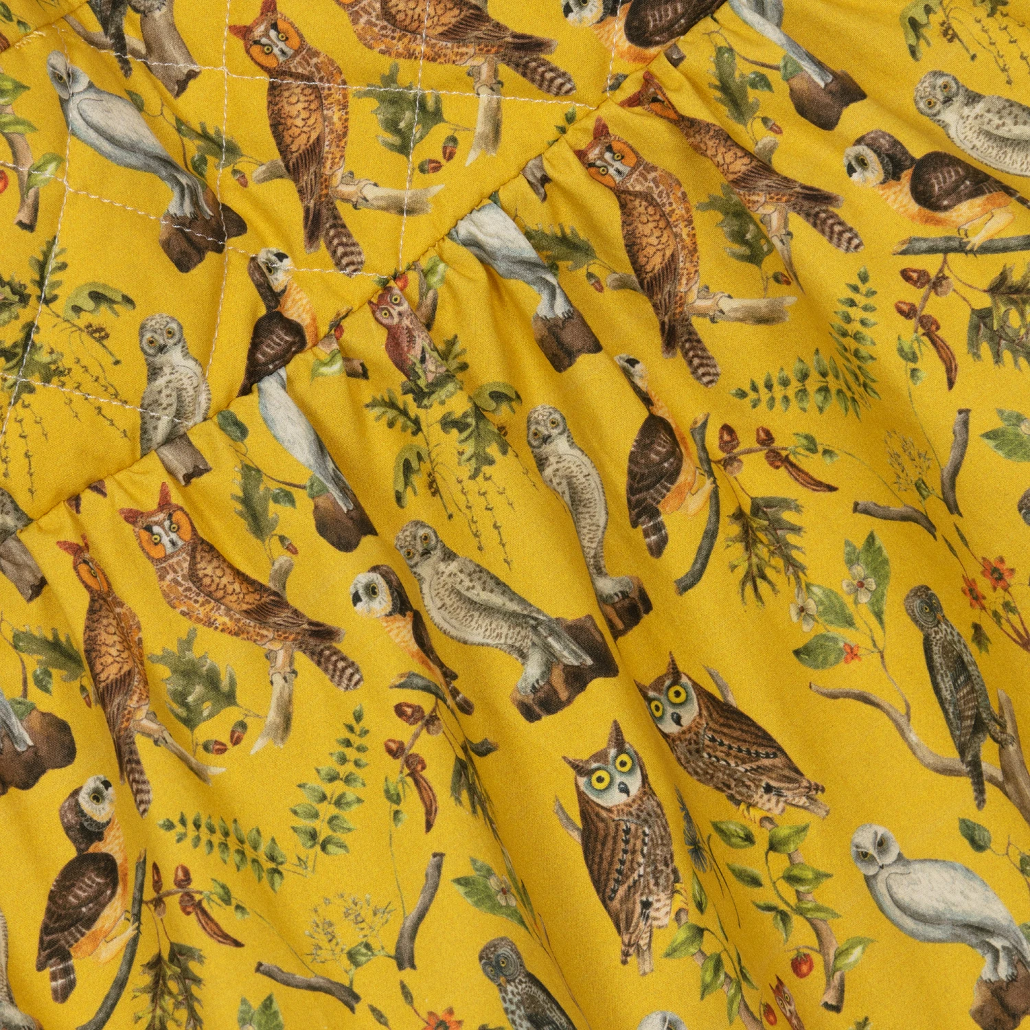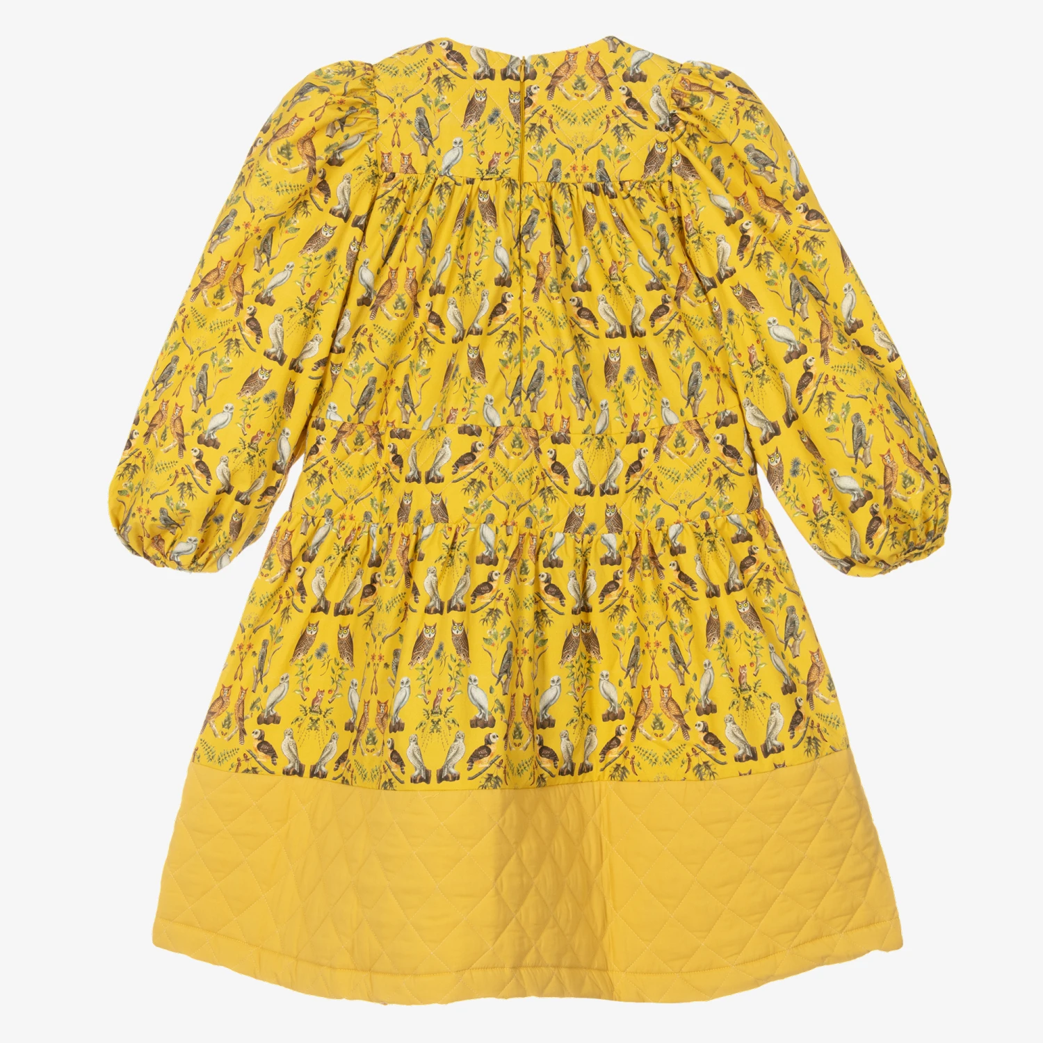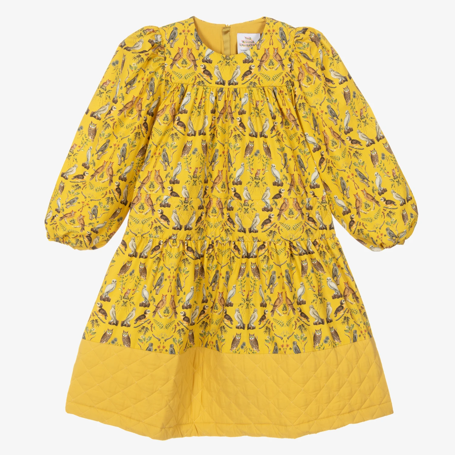 Gorgeous yellow dress for teen girls by British brand The Middle Daughter. The eye-catching print has brown and grey owls. The voluminous shape with quilted panels and balloon sleeves make a statement. Made in smooth cotton sateen, it fastens on the back with a concealed zip.