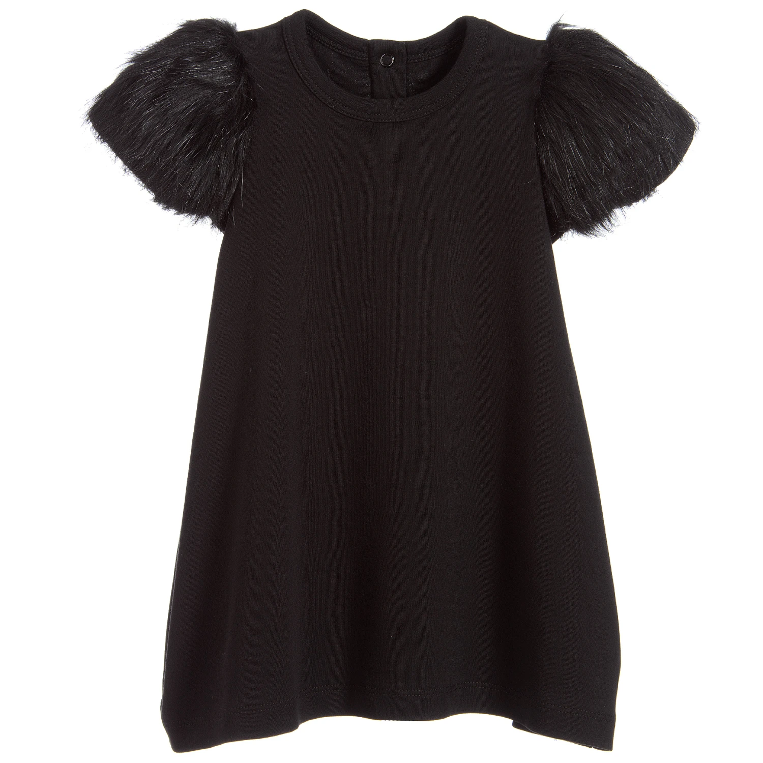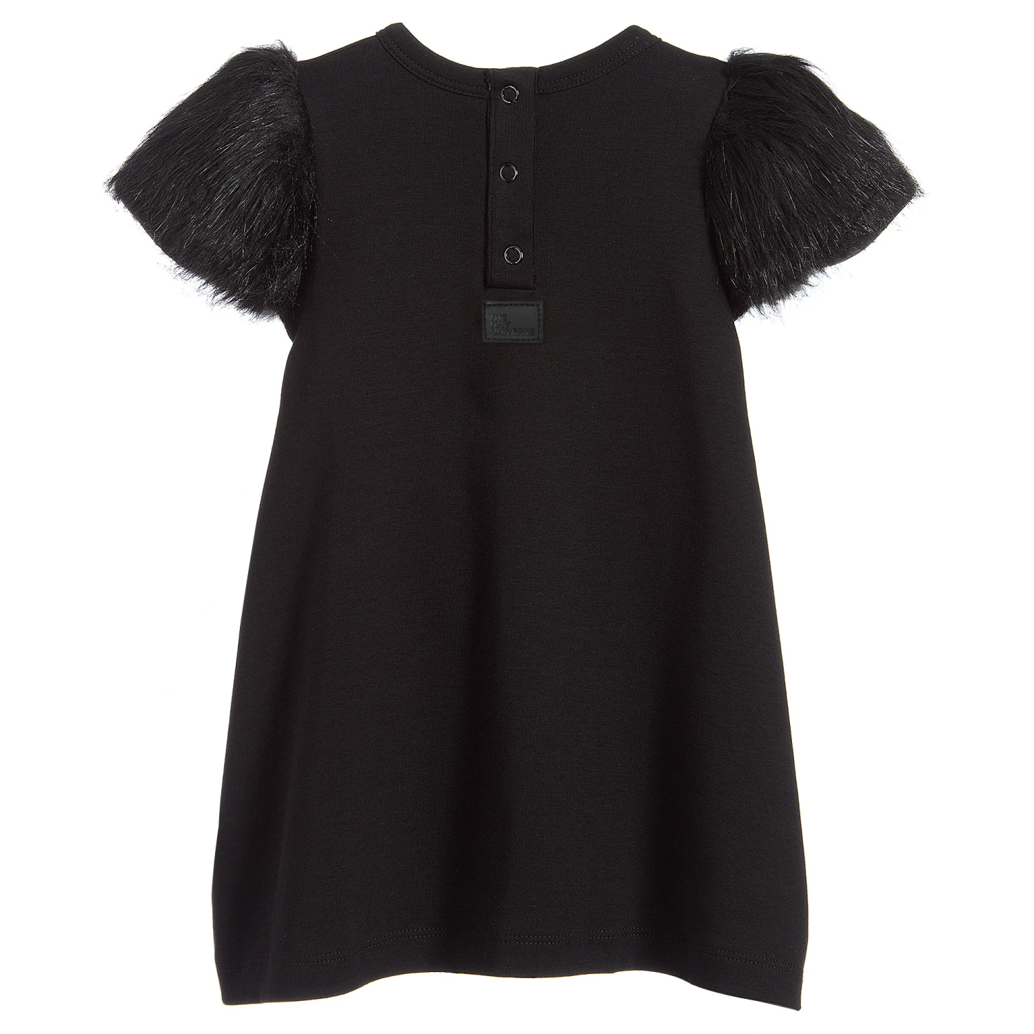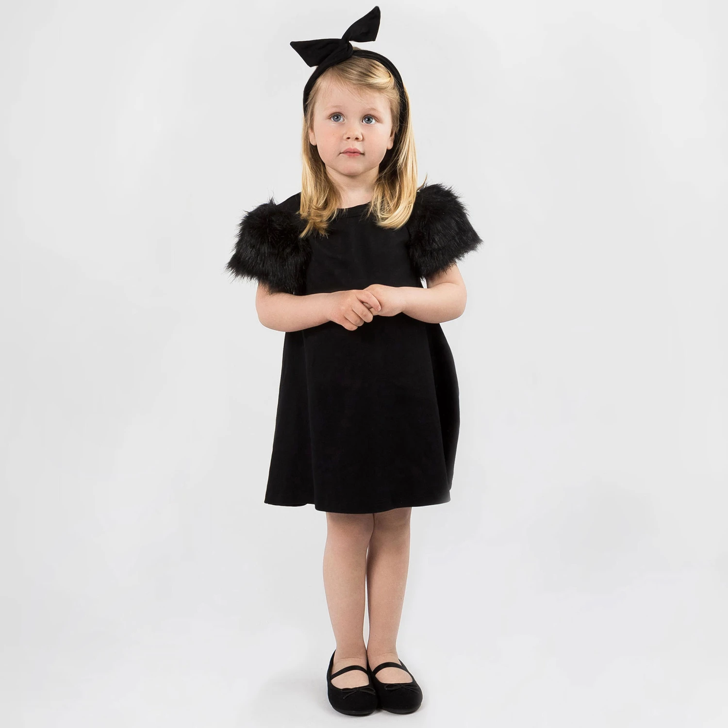 The Tiny Universe girls black dress made from soft and stretchy organic cotton jersey, with soft, faux fur puff sleeves. The classic flared style has a popper opening on the back for easy dressing.