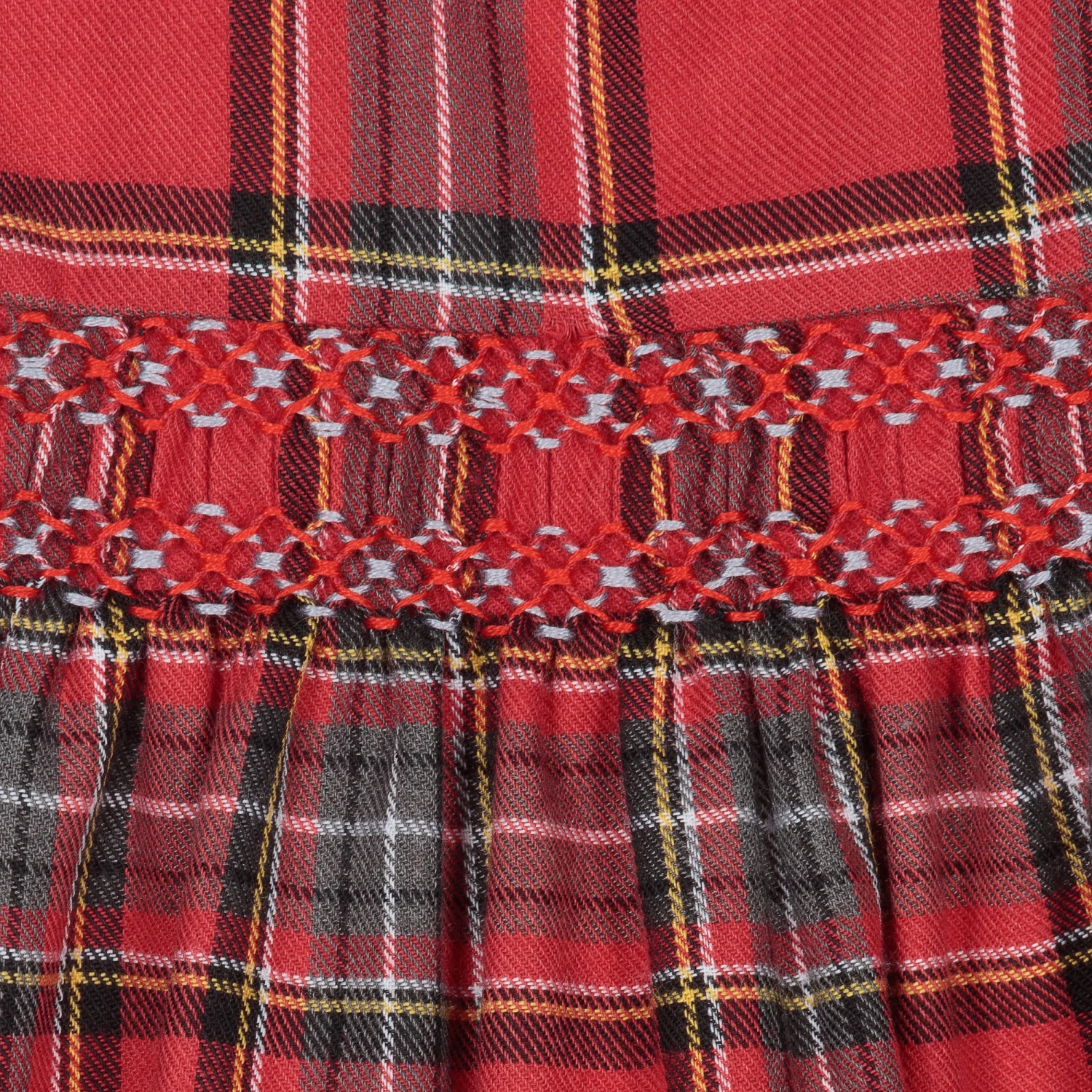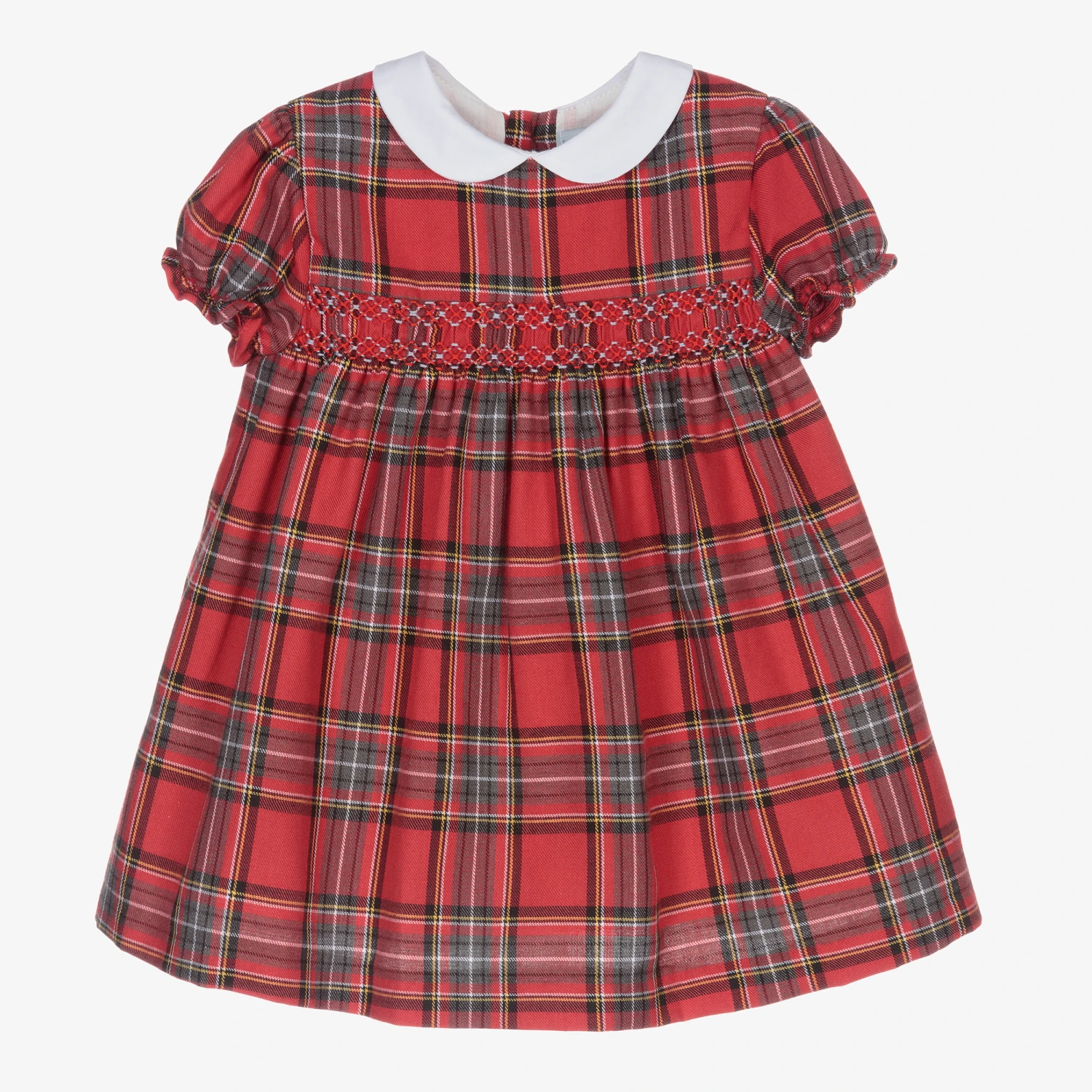 Pretty red, grey and yellow tartan dress for baby girls by Tutto Piccolo. Made in soft cotton-blend twill, it has a white rounded collar, smocking on the chest, and puffed sleeves with elasticated cuffs. The dress is comfortably lined in lightweight polycotton and fastens with buttons on the back.