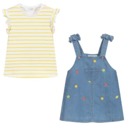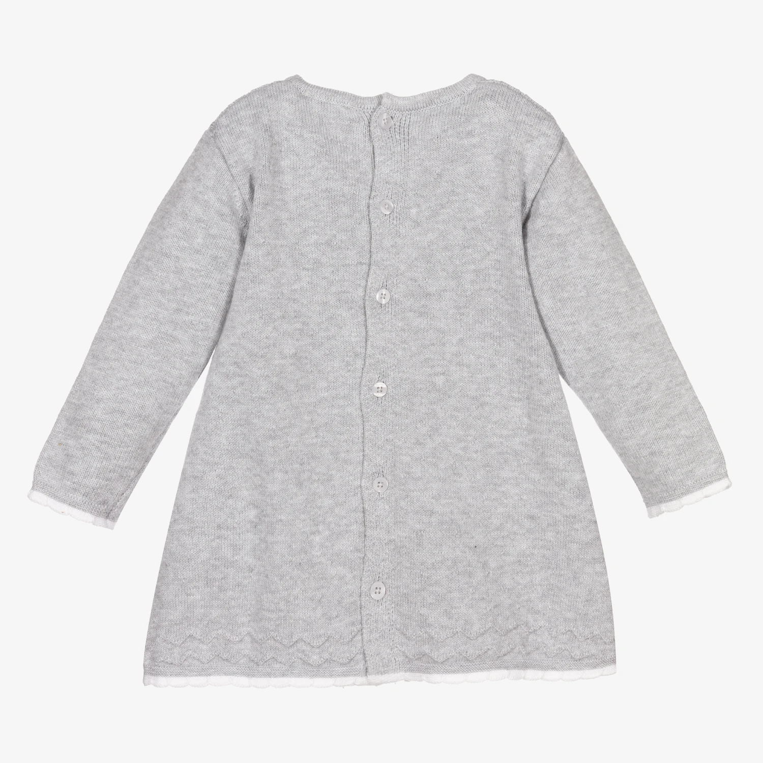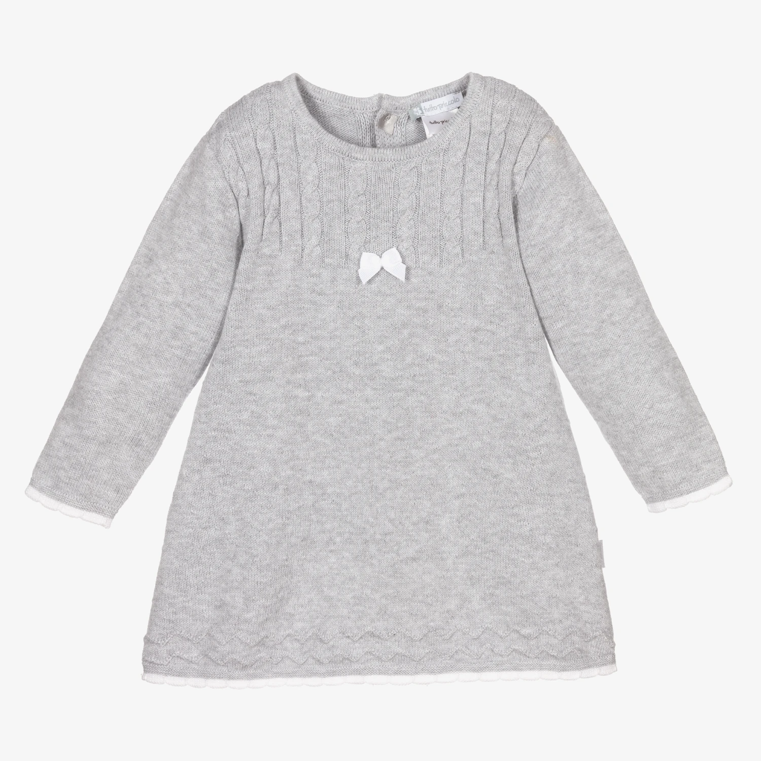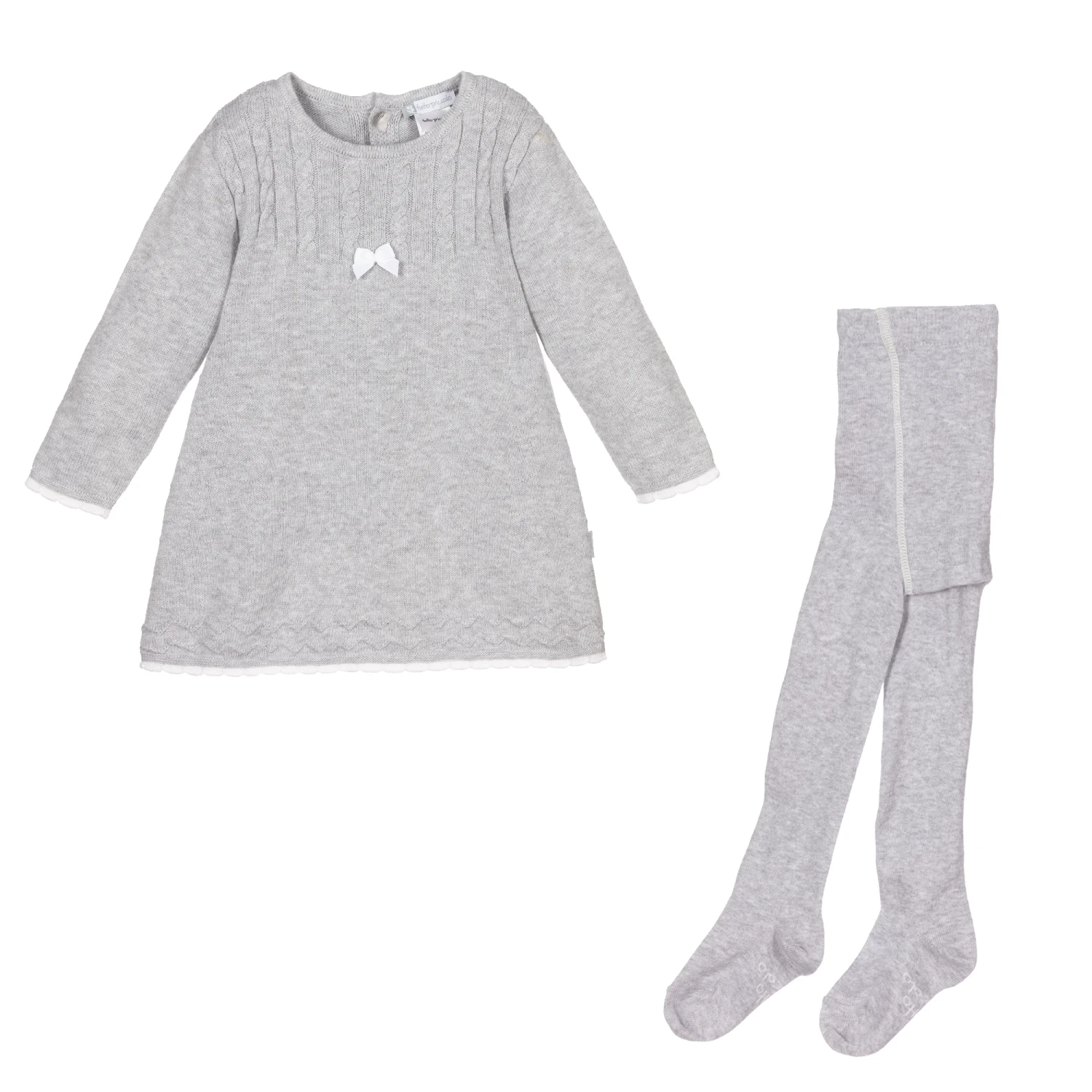 Sweet grey dress and tights set for baby girls by Spanish brand Tutto Piccolo. Knitted in a soft cotton and wool blend, dress has cable stich detailing on the bodice, with white trim on the cuffs and hem. The matching tights are in soft and stretchy cotton, with logo branding on the feet.