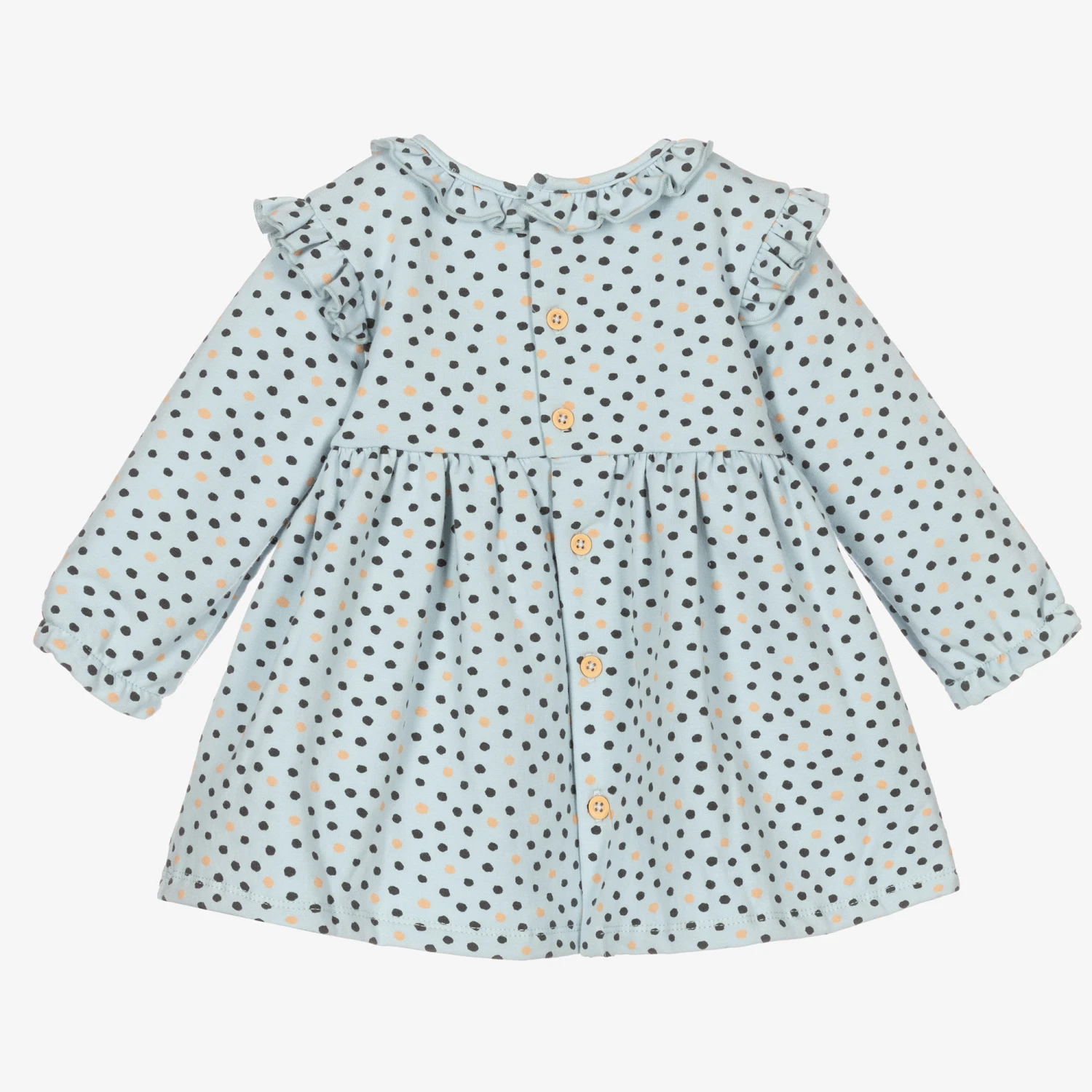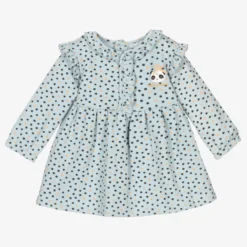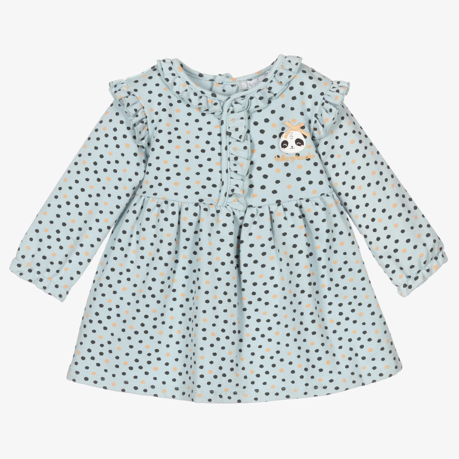 Sweet dress and tights set for baby girls by Spanish brand Tutto Piccolo. Made in mid-weight cotton jersey, the sea blue-green dress has a grey and beige dot pattern, with pretty ruffle trims. The teal blue tights are in soft and stretchy cotton, with logo branding on the feet.