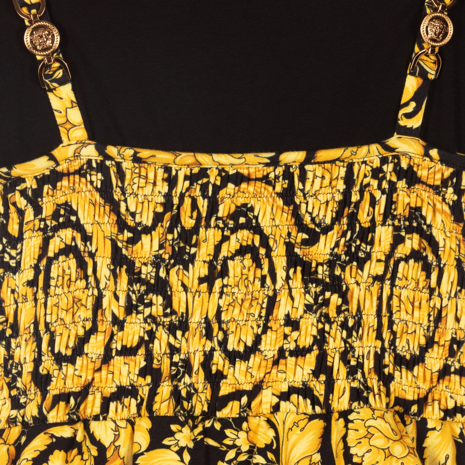 Black and gold dress for teen girls by Italian luxury brand Versace, made in soft and stretchy cotton jersey. This stylish dress has the appearance of a two-piece with a black T-shirt under a gold Barocco print dress. The straps are detailed with gold-tone Medusa hardware on the straps. It is shirred across the chest and the skirt has layers of ruffles.