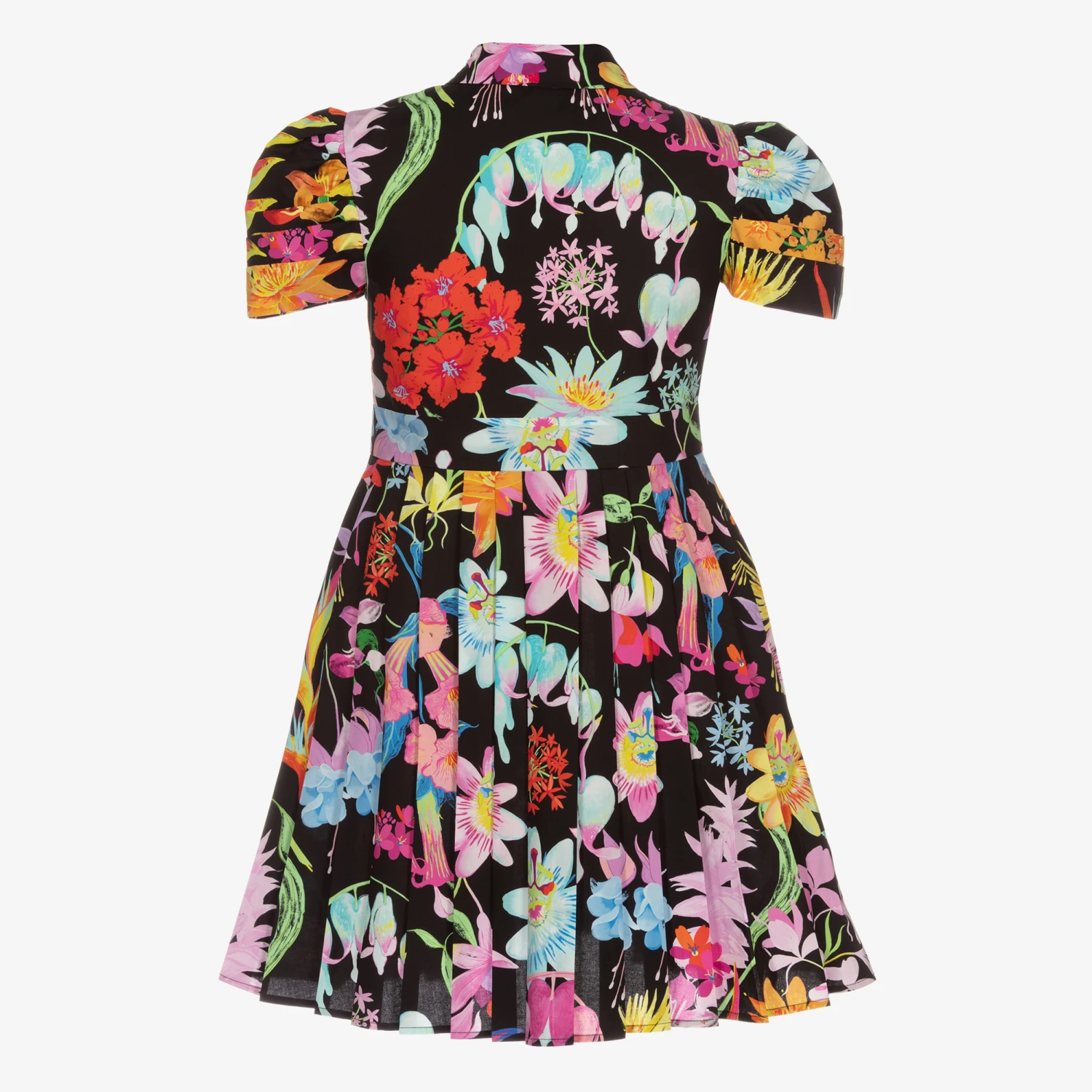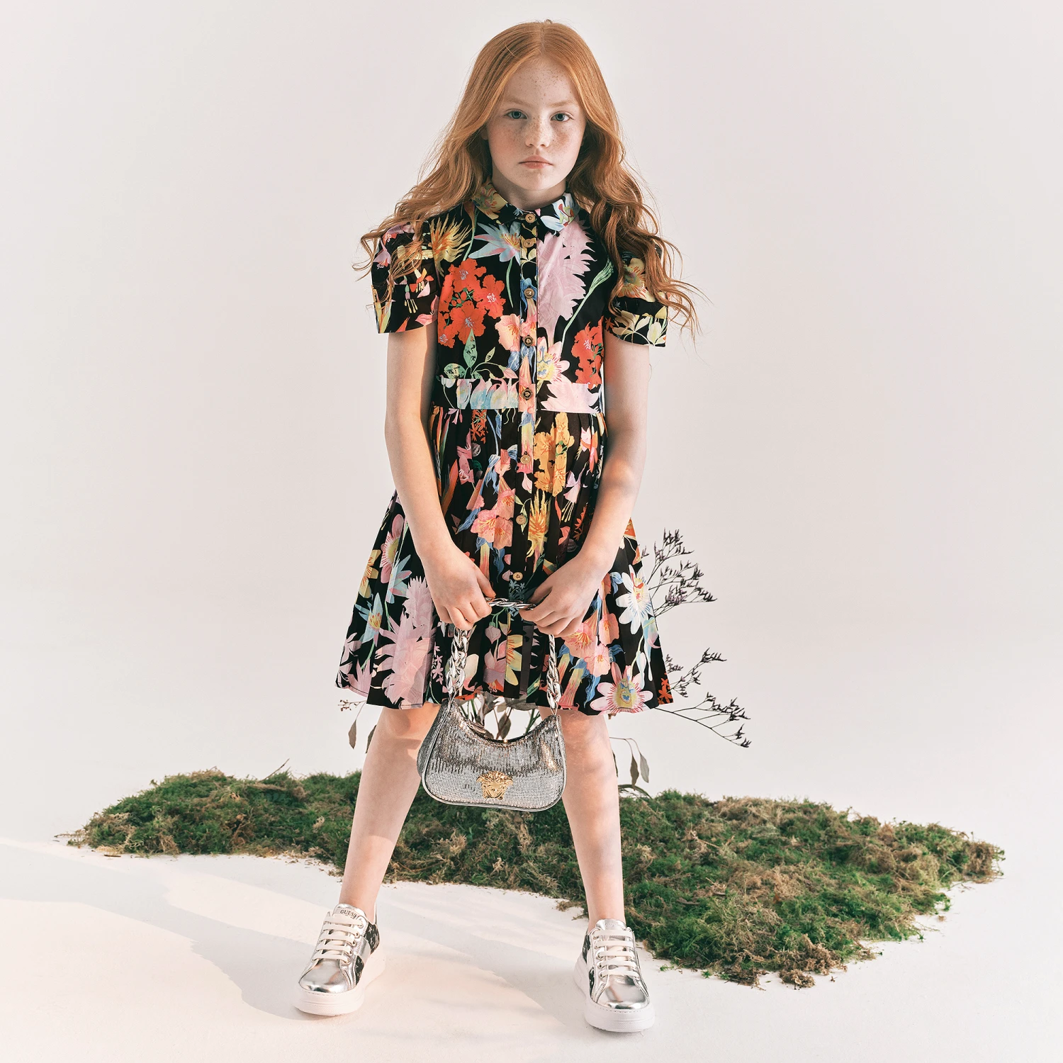 A classy black dress for teen girls by luxury Italian brand Versace, made in soft and lightweight cotton. Beautifully patterned with the brand’s distinctive and colourful Jardin print, this dress has a pleated skirt and gold 3D Medusa front button fastenings.
