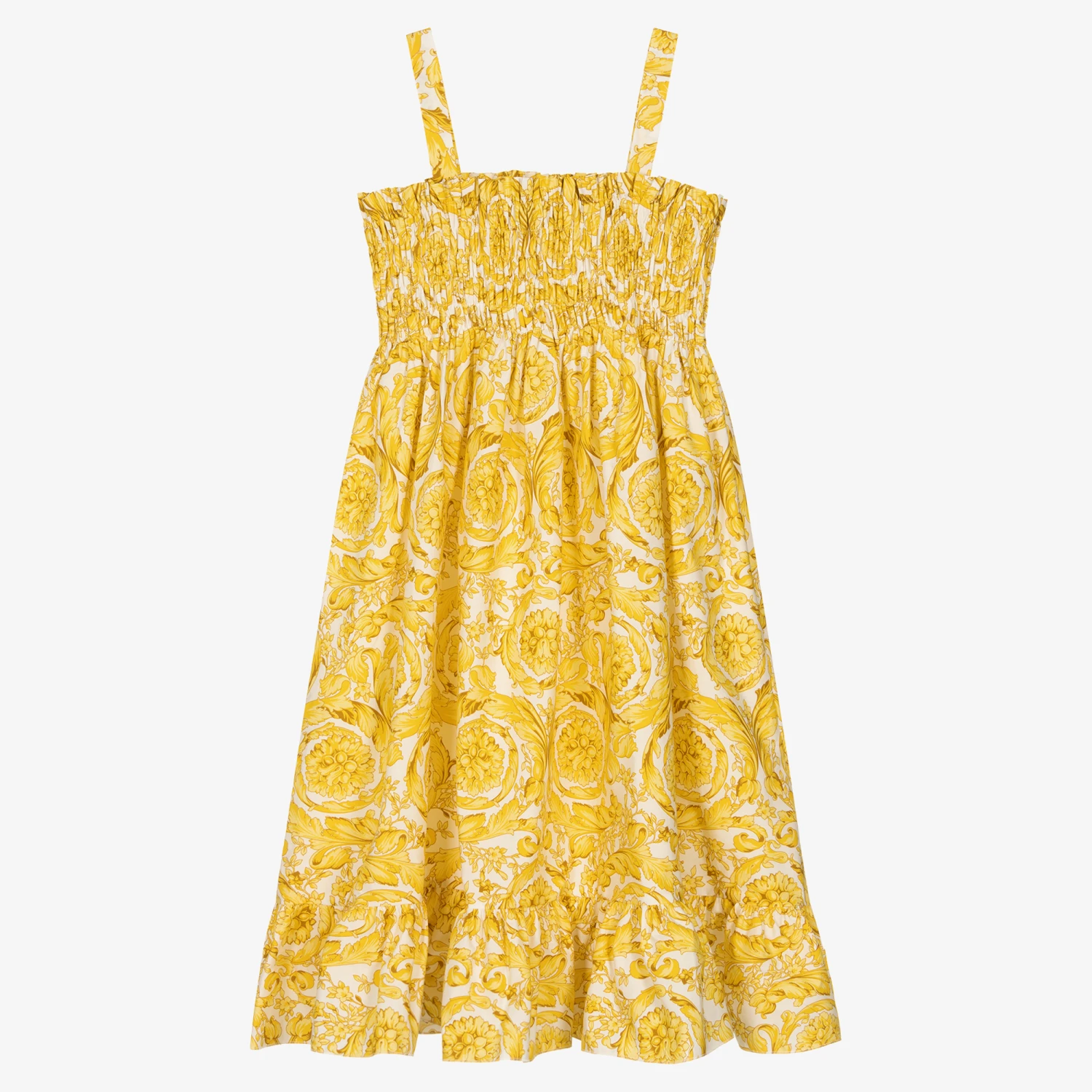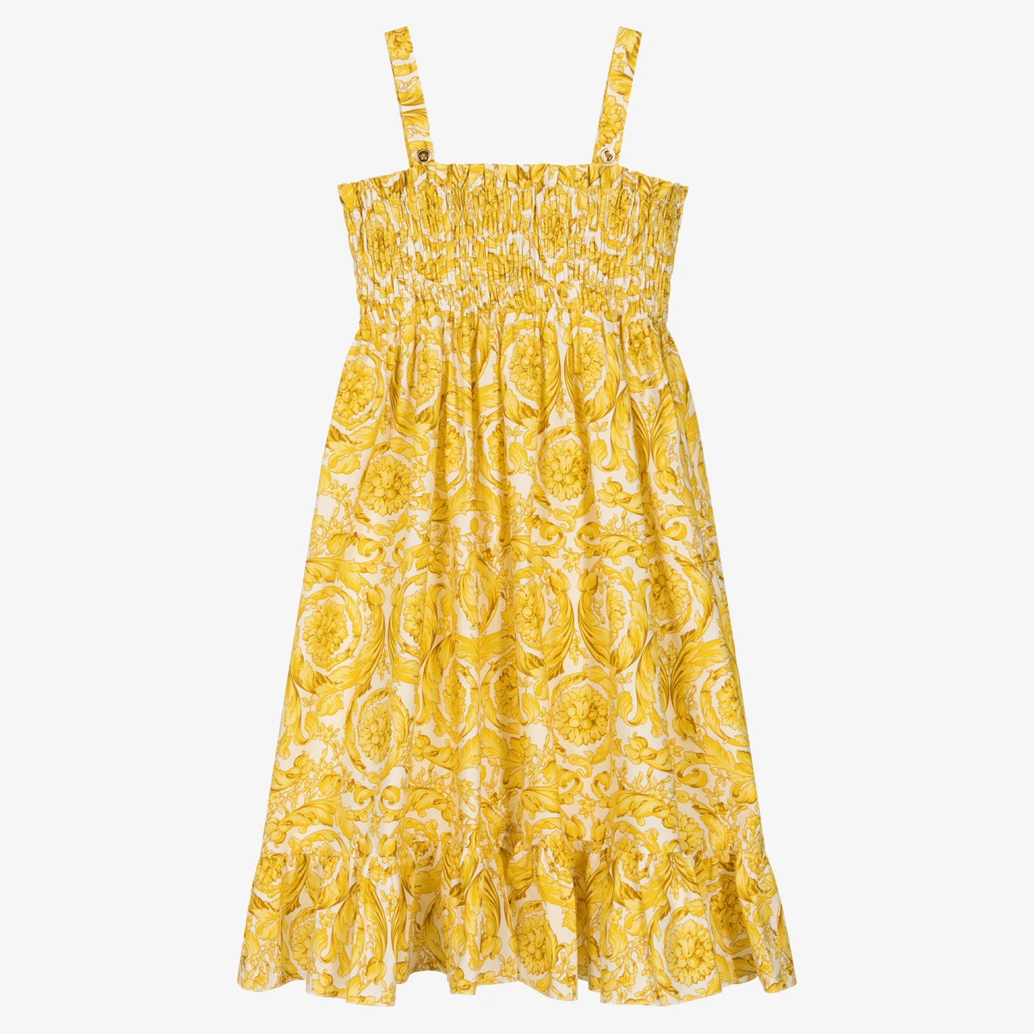 In the signature Barocco print, this white and gold dress for teen girls is from luxury fashion house, Versace. Gold buttons, embossed with the eye-catching Medusa logo, are decorated on the shoulder straps. The stylish shirred bodice and ruffled hem add opulence to this warm weather style. This dress is made from luxuriously soft and lightweight cotton poplin.