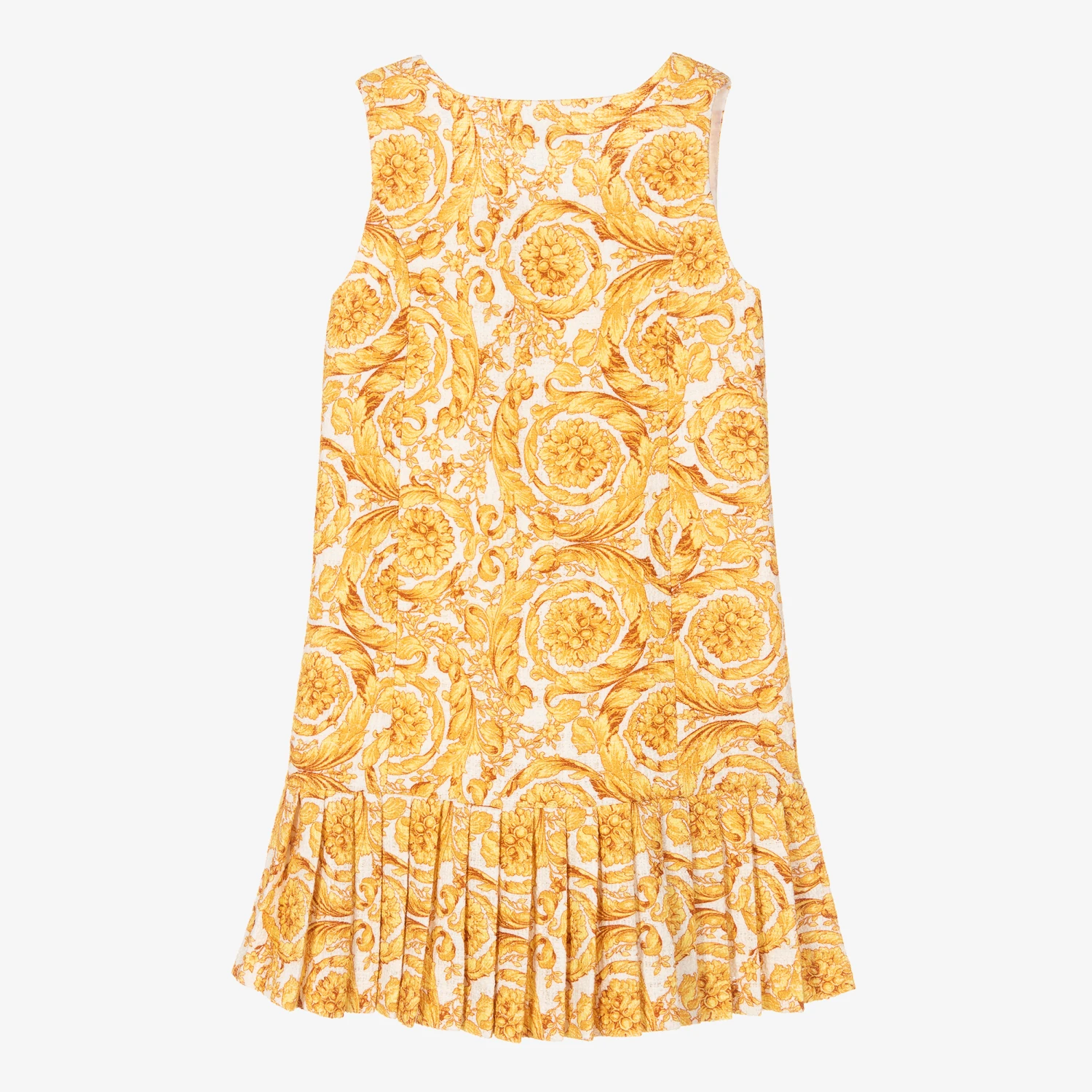 Instantly recognisable, this stunning white and gold dress for teen girls is from luxury fashion house, Versace. Patterned in the brand’s iconic gold Barocco design, this dress offers an opulent designer style. It fastens beautifully with gold Medusa buttons, and has a square neck with a pleated hem for an elegantly preppy look. It is made from the softest cotton tweed, with a delicate silky lining.