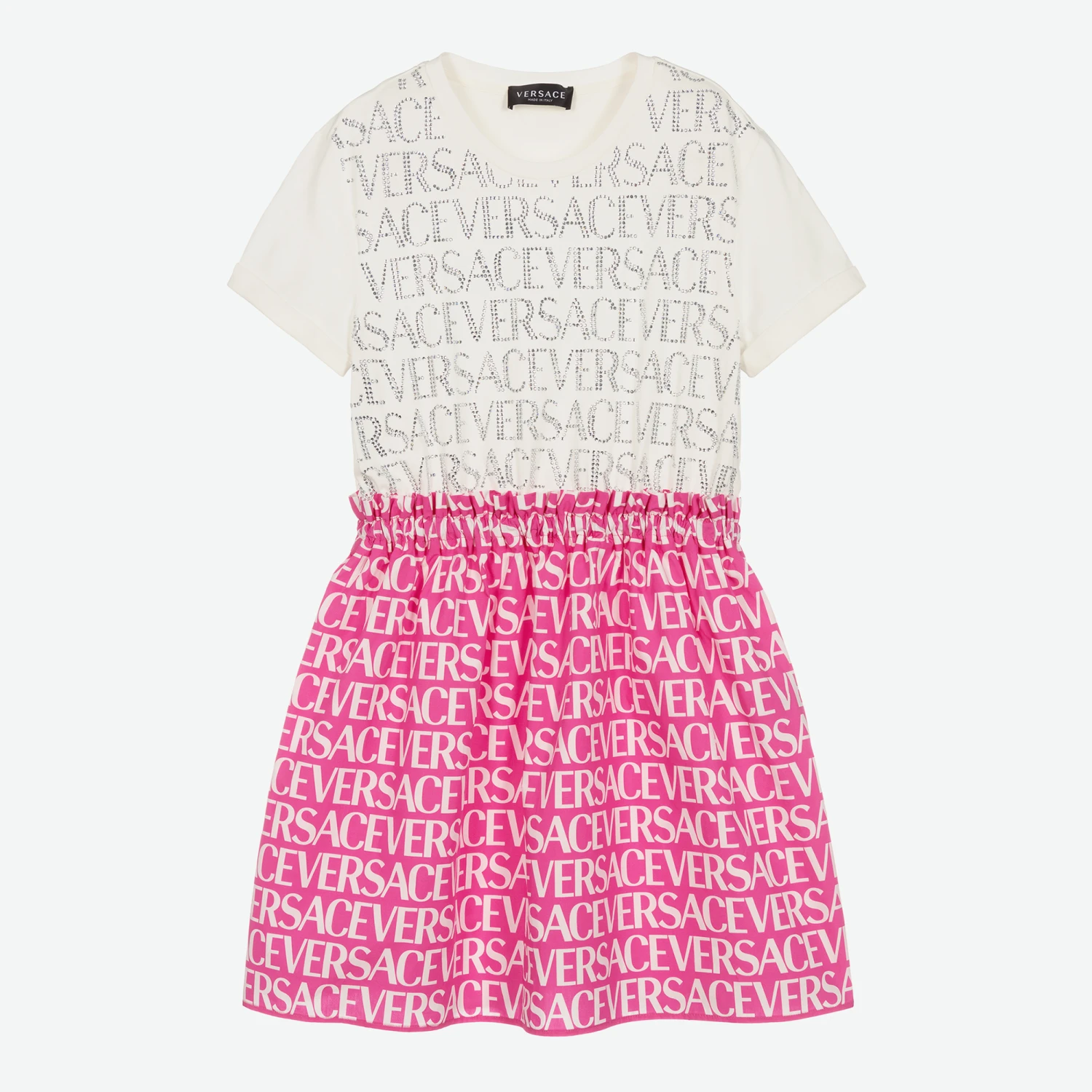 Glamorously casual, this ivory and pink dress for teen girls is from luxury fashion house, Versace. Showcasing the designer’s iconic repeat logo, the cotton jersey bodice is decorated in diamanté’s, with a matching print on the poplin skirt. Made from super soft cotton, it is finished with roll-up sleeves and a stylish paperbag waist.