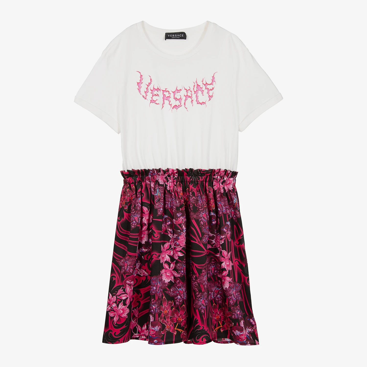 An instantly recognisable white and pink T-shirt dress for teen girls by luxury brand Versace. Promising style and comfort, the cotton jersey tee has a large pink flaming Versace Logo on the front and a ‘How Versace are you?’ slogan print on the back. The silky soft twill skirt is designed in the brand’s dark Orchid Barocco print featuring pink and blue florals and glowing pink zebra stripes.