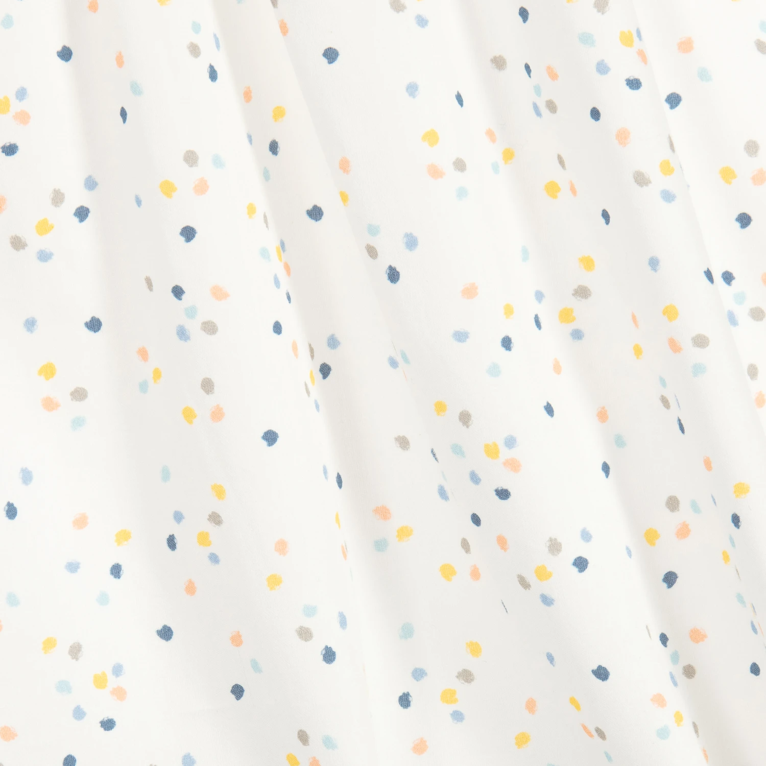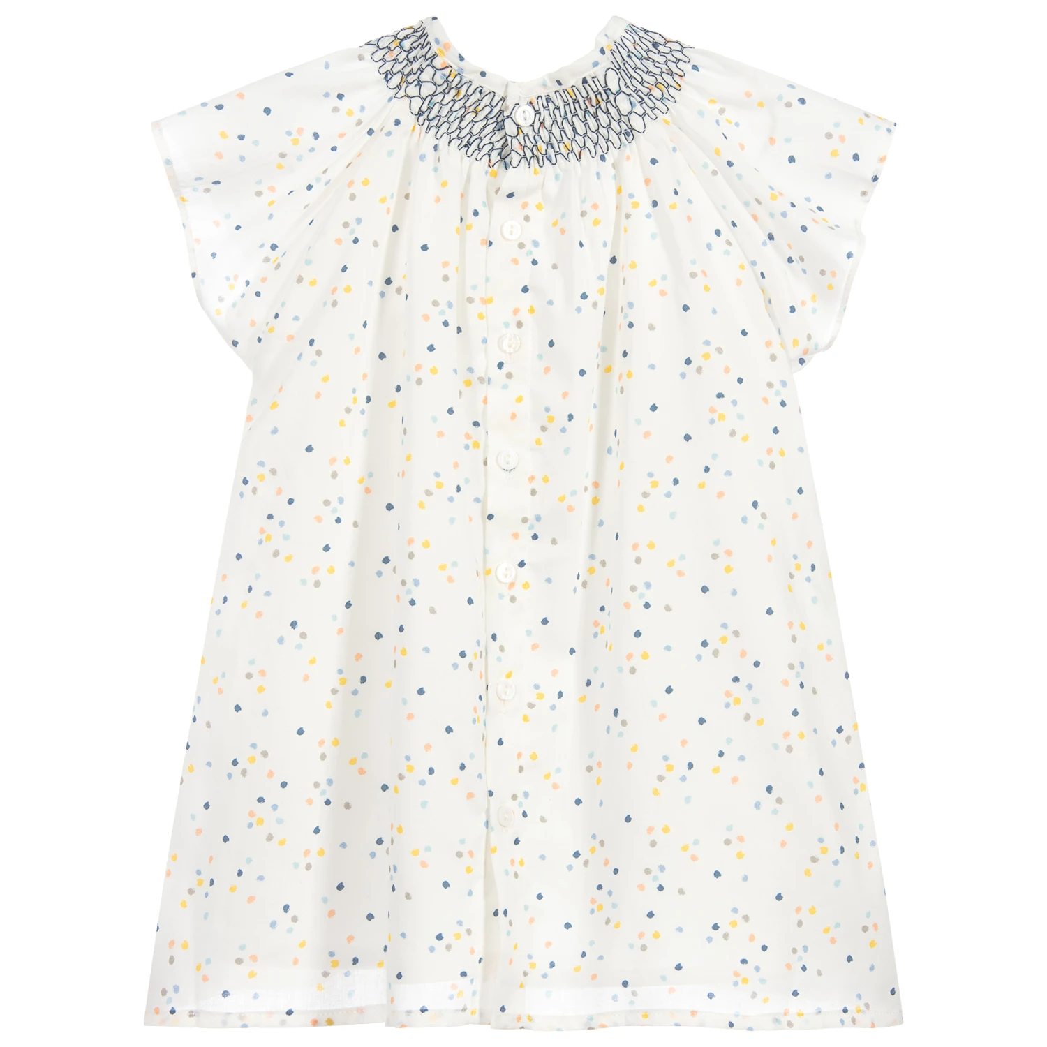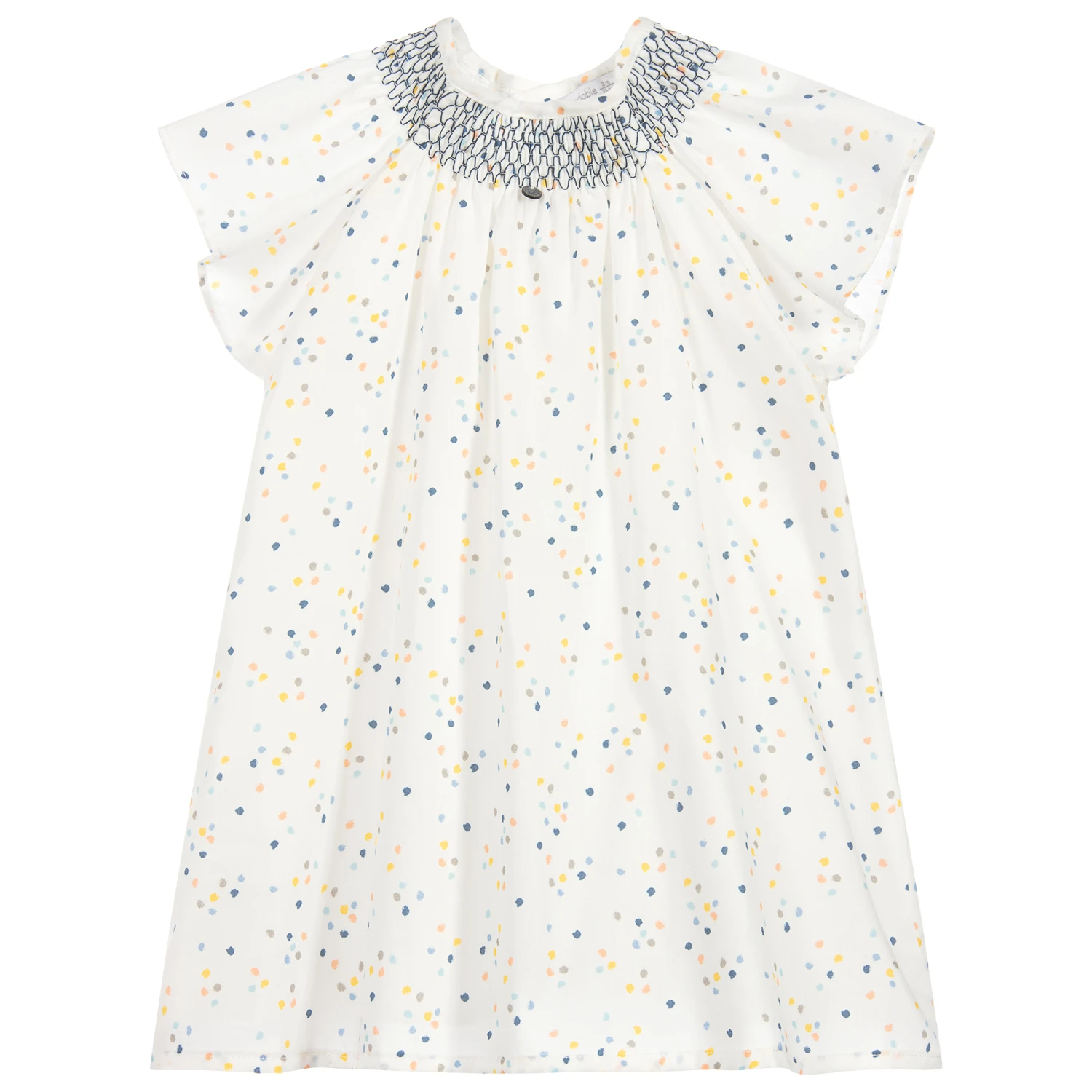 A sweet ivory dress for baby girls by Wedoble, with a colourful spot print. It is made and lined in lightweight cotton, with pretty navy blue smocking around the neck with a logo charm and flutter sleeves.