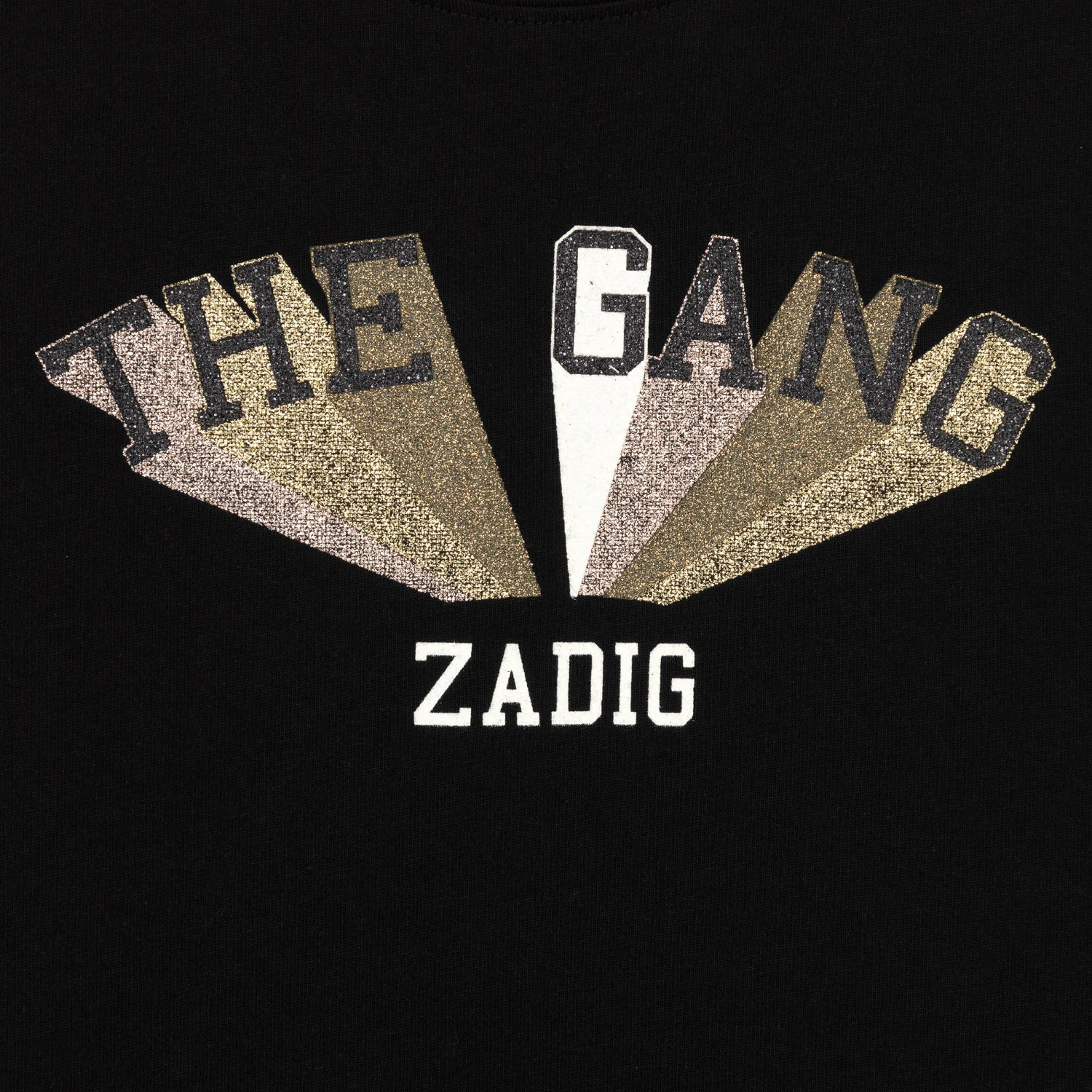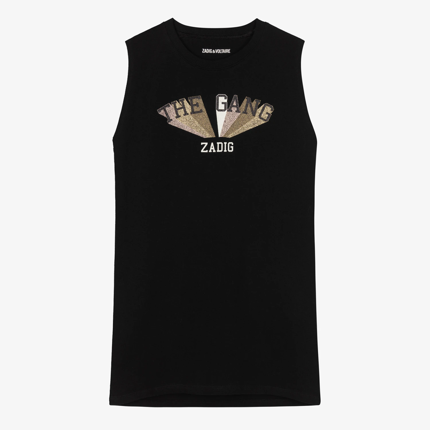 Grungy black sleeveless dress for teen girls by French brand Zadig & Voltaire Kids, made in soft cotton jersey. It has a white logo print on the front with a glittery gold and pink ‘The Gang’ slogan. To also be worn as a beach cover-up, it comes in a comfortable straight fit, with a hem on the back that is slightly longer.