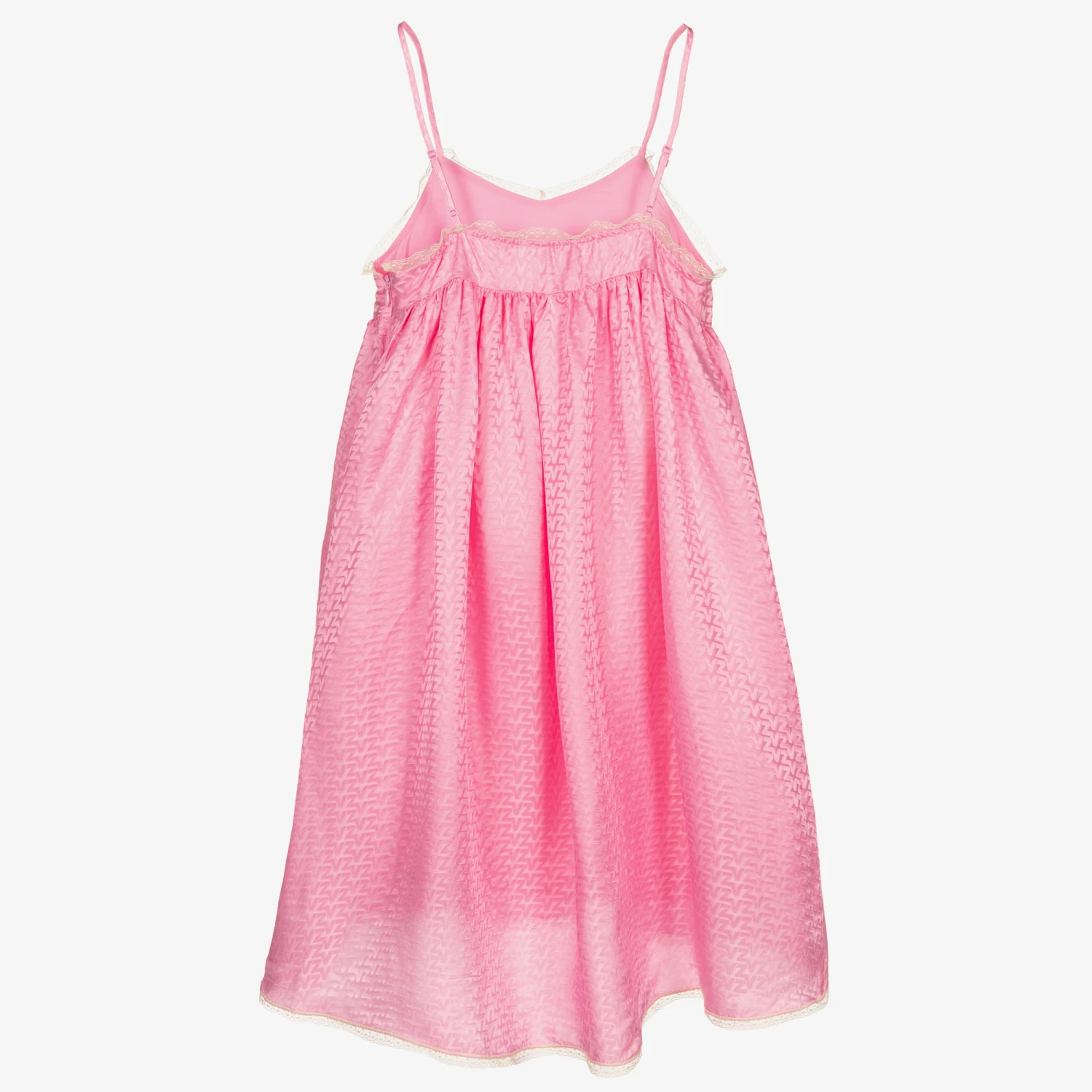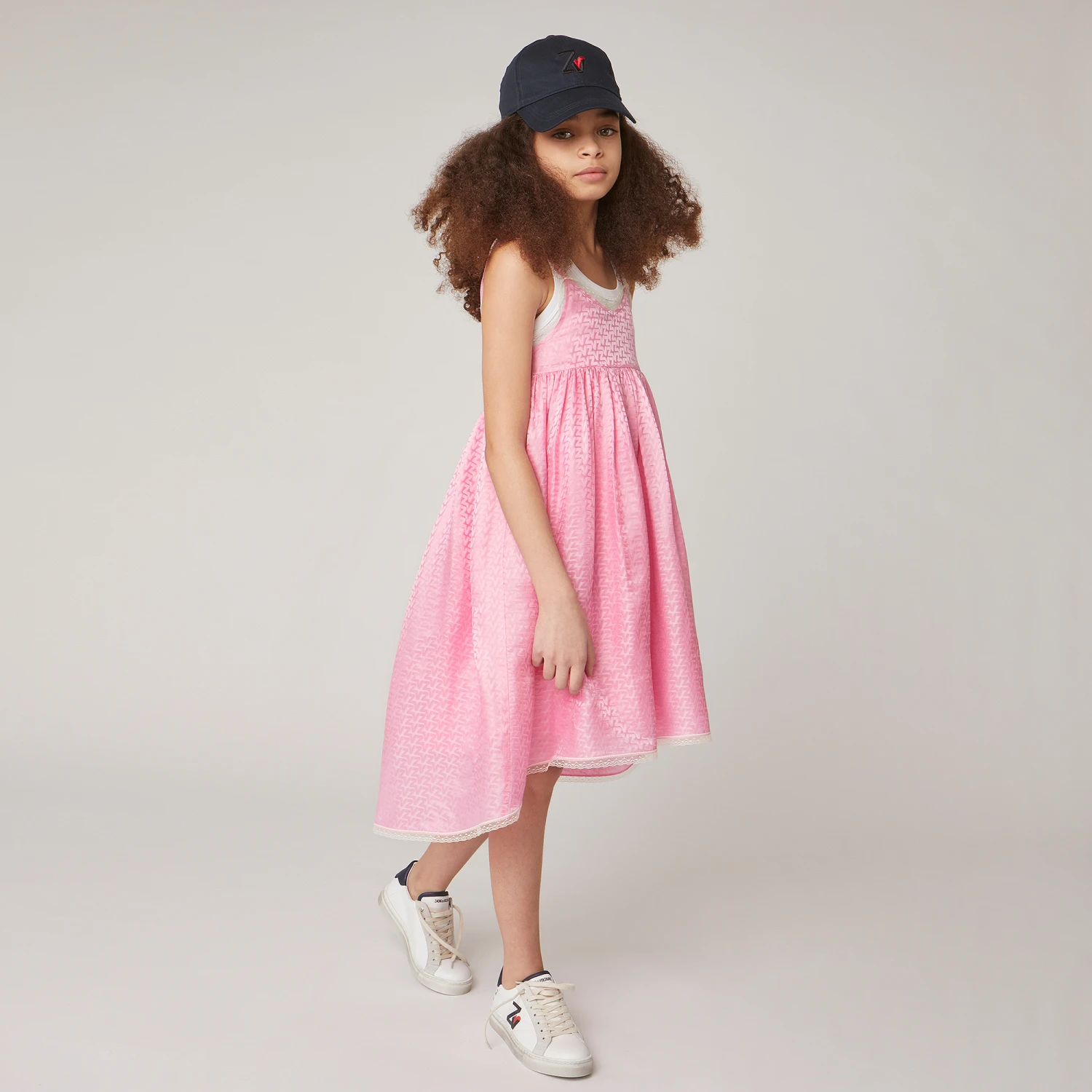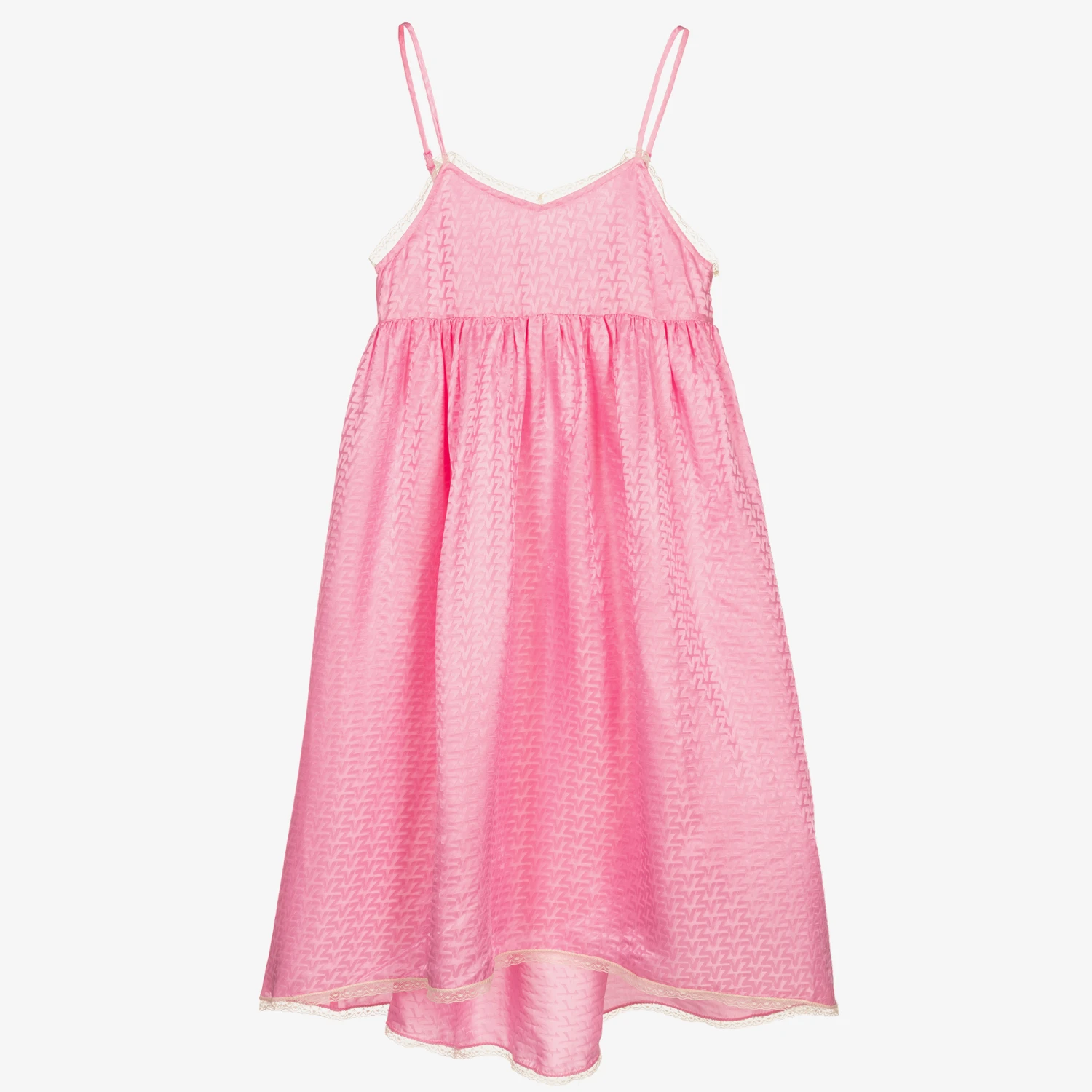 As seen in the main collection, versatile pink strappy dress for teen girls by Zadig & Voltaire Kids, with a jacquard logo pattern all-over. Trimmed with delicate ivory lace, it has adjustable shoulder straps, and is made in a luxurious blend of silk and viscose.